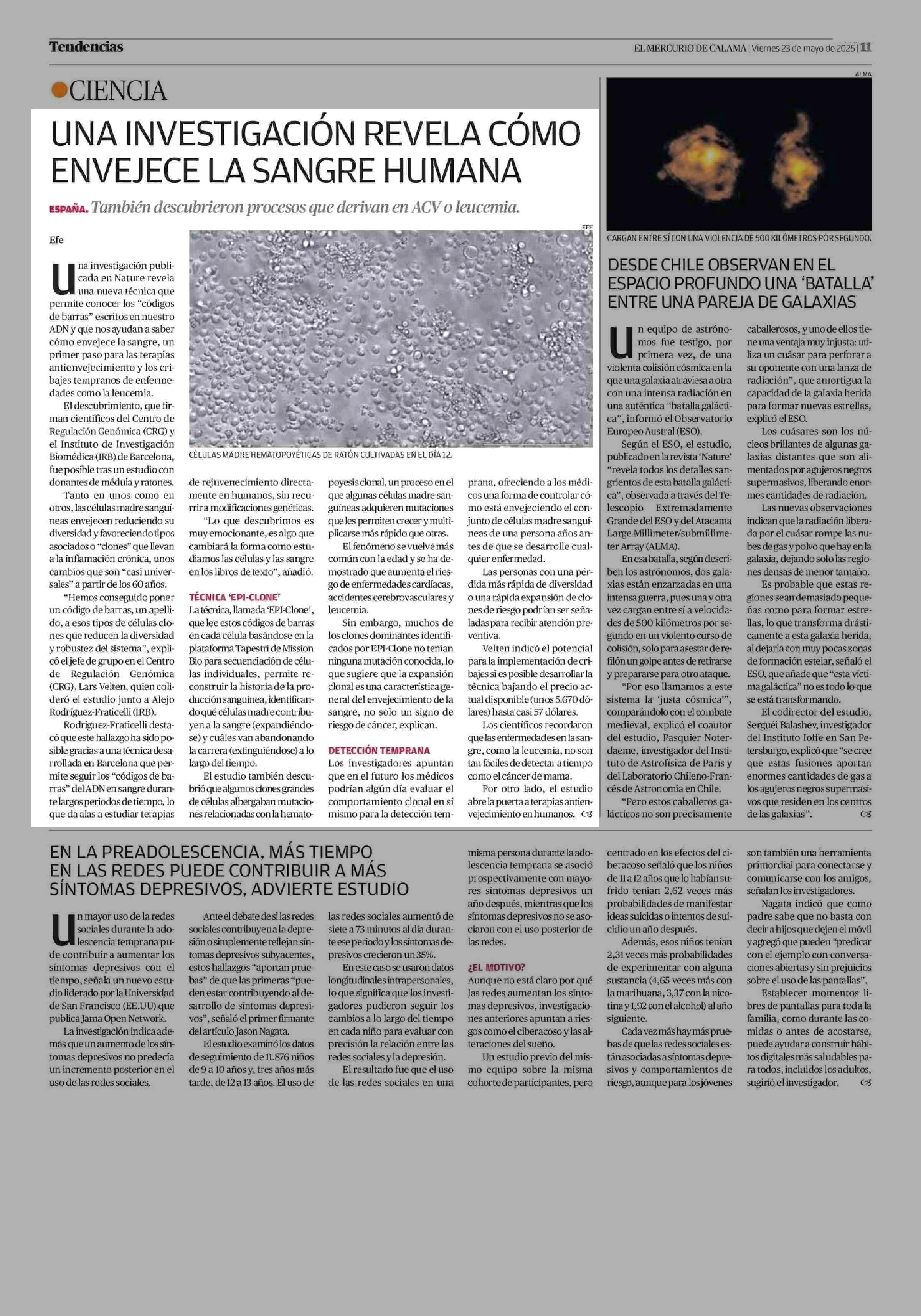 UNA INVESTIGACIÓN REVELA CÓMO ENVEJECE LA SANGRE HUMANA 23-05-2025 El Mercurio de Calama |
