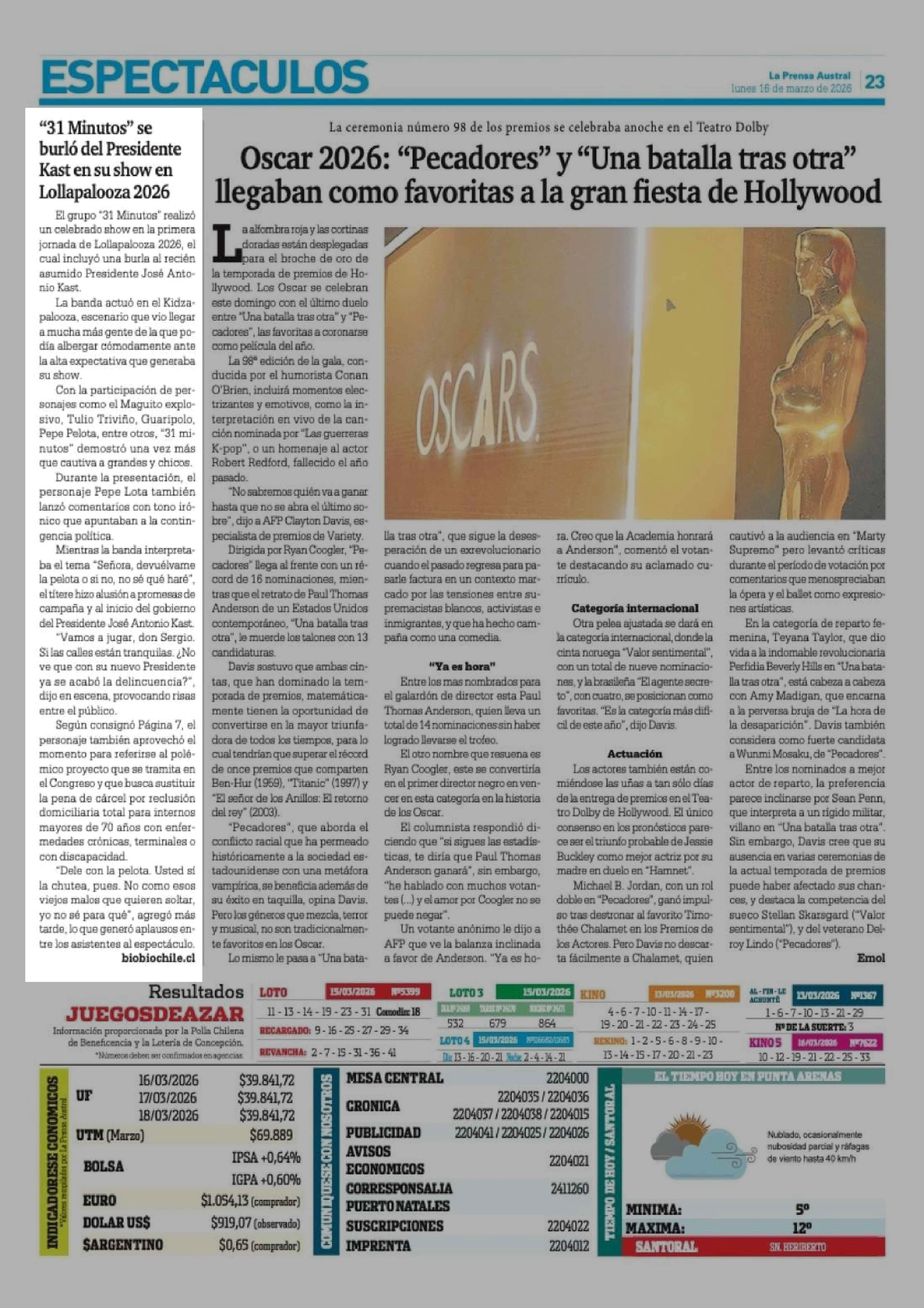 "31 Minutos" se burló del Presidente Kast en su show en Lollapalooza 2026 16-03-2026 La Prensa Austral |