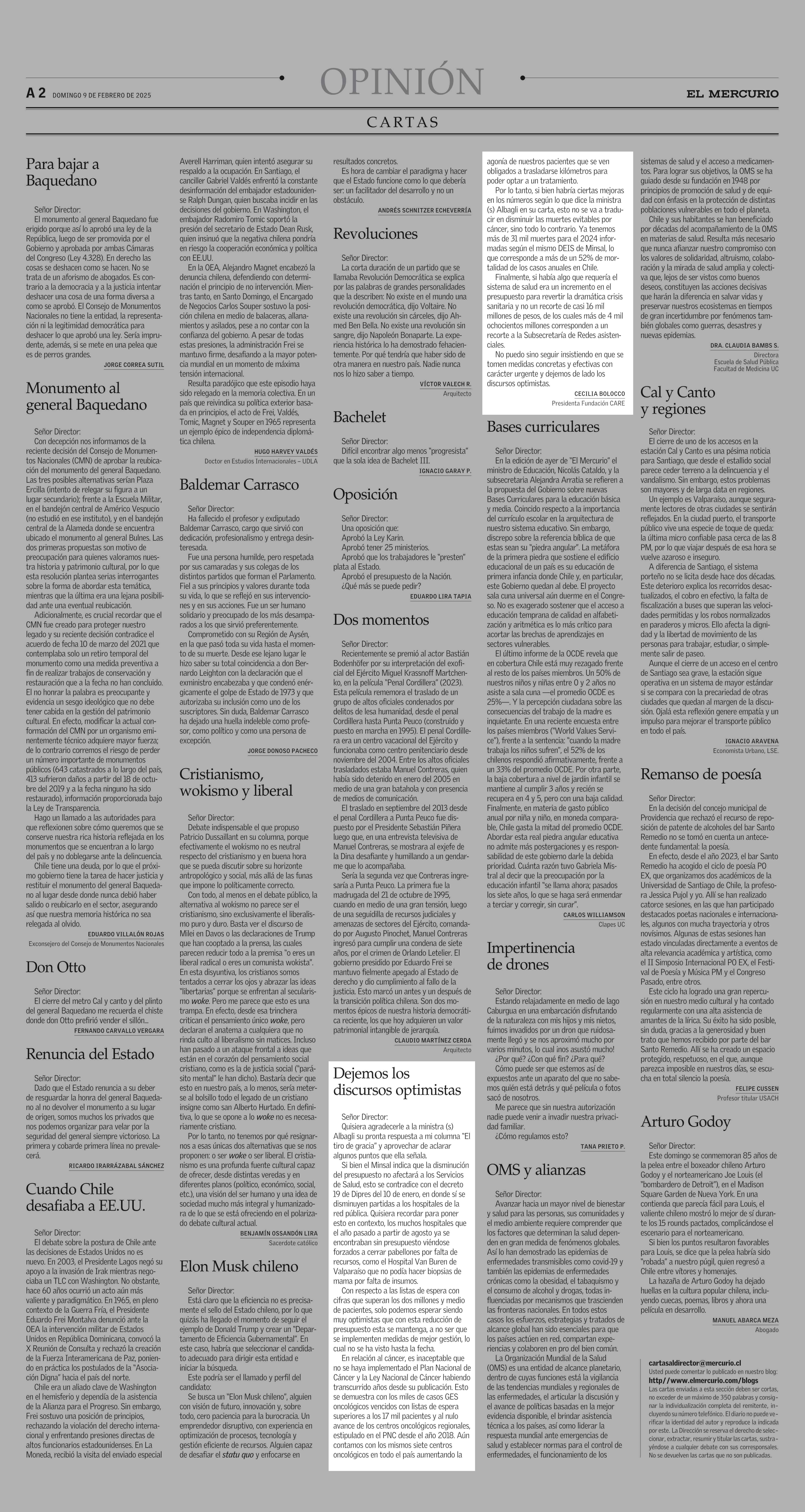 CARTAS: Dejemos los discursos optimistas 09-02-2025 El Mercurio |