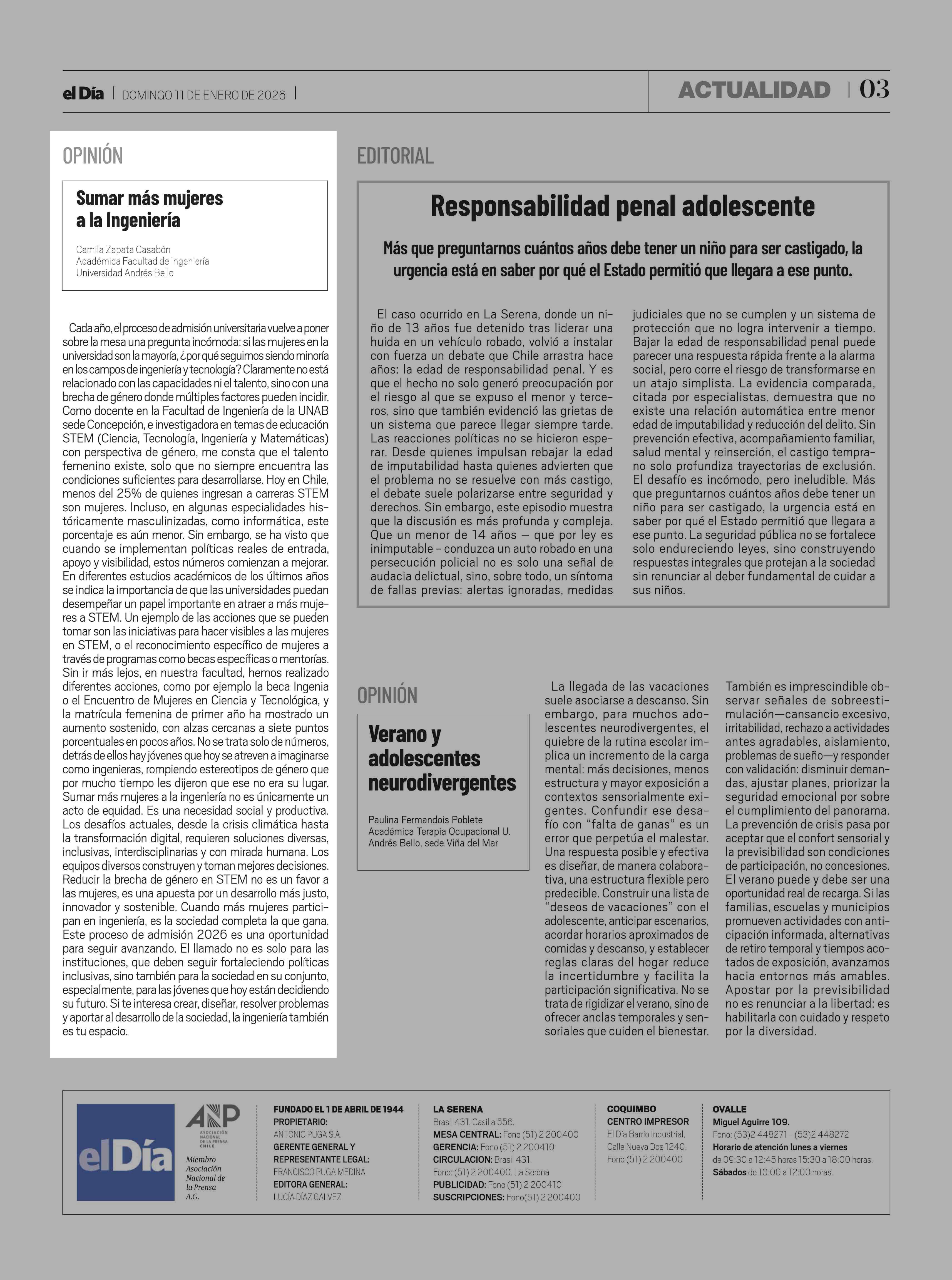Columnas de Opinión: Sumar más mujeres a la Ingeniería 11-01-2026 El Día |