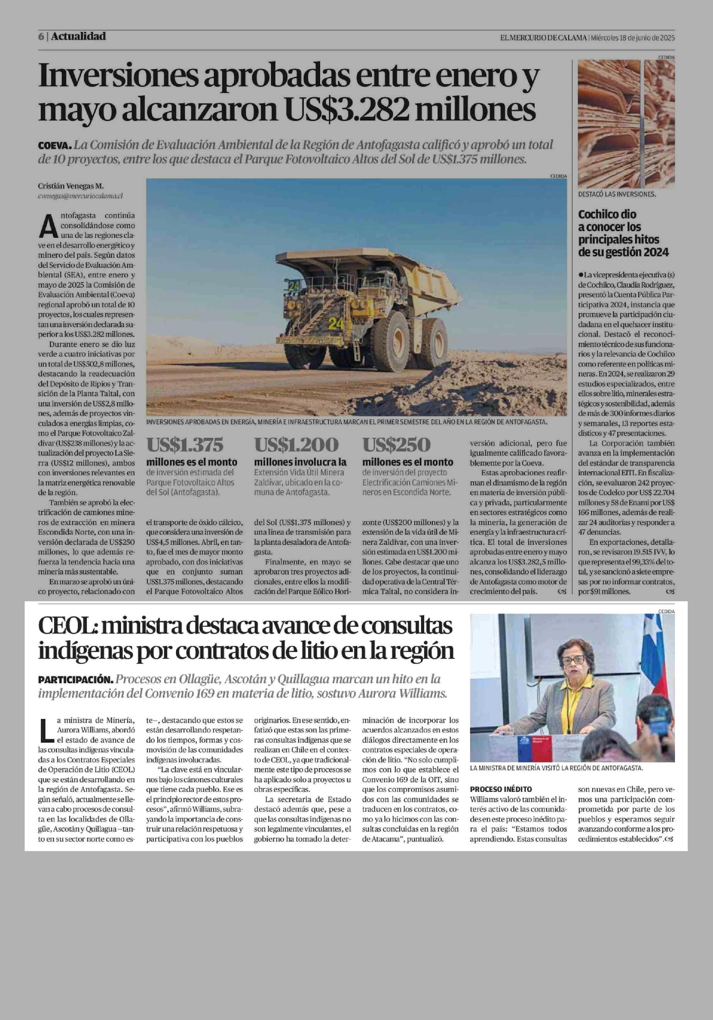CEOL: ministra destaca avance de consultas indígenas por contratos de litio en la región 18-06-2025 El Mercurio de Calama |