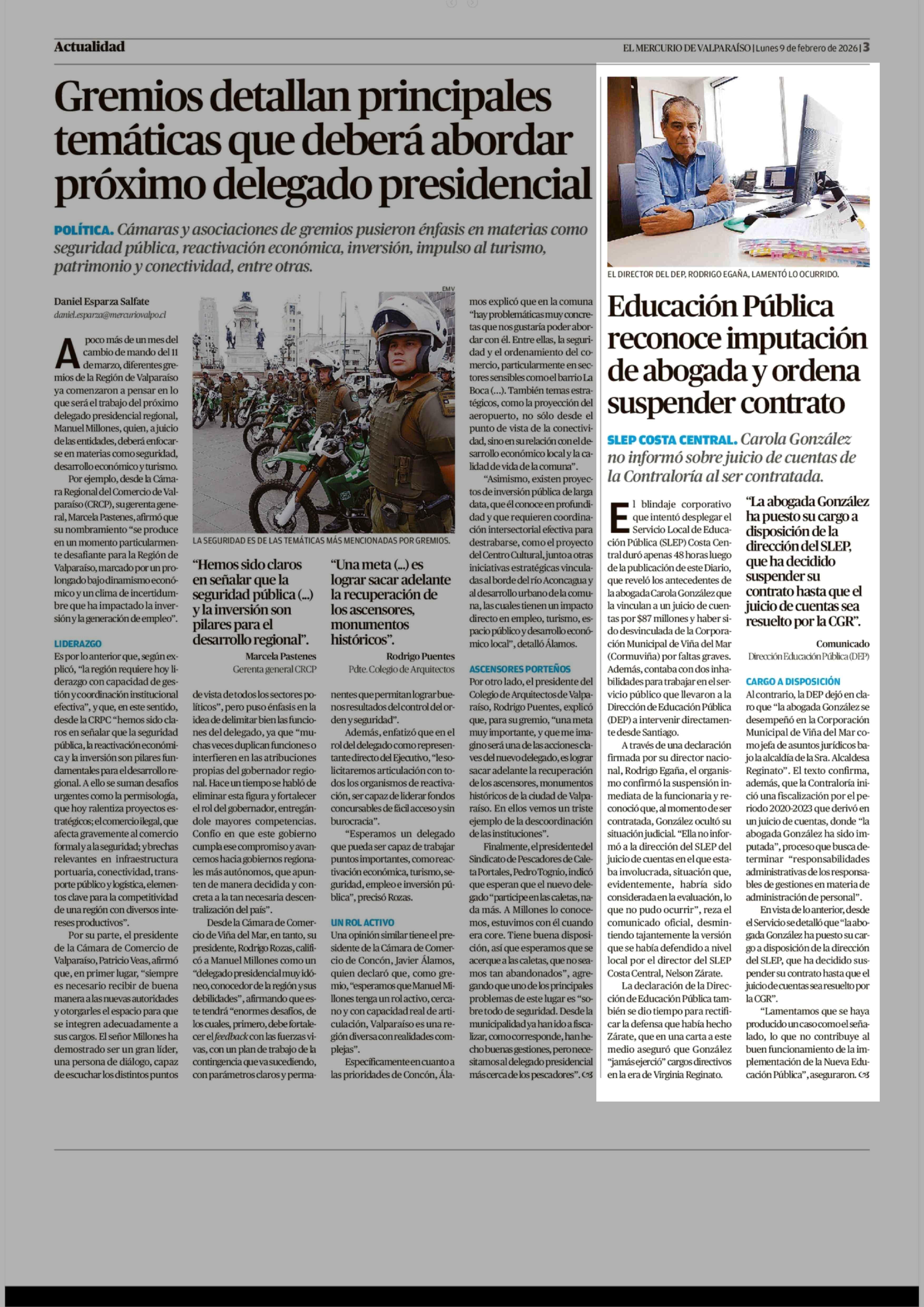 Educación Pública reconoce imputación de abogada y ordena suspender contrato 09-02-2026 El Mercurio de Valparaíso |