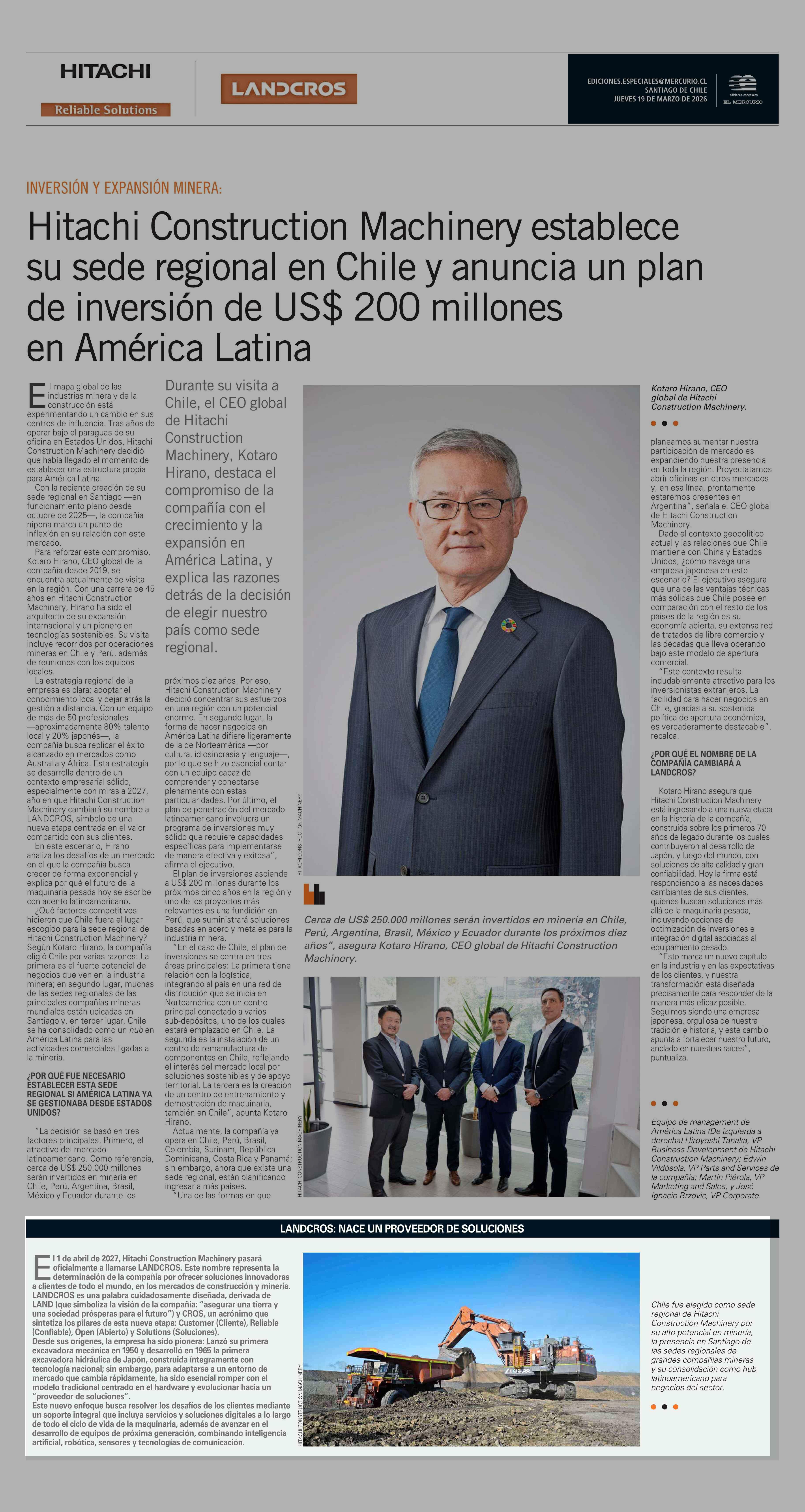 El 1 de abril de 2027, Hitachi Construction Machinery pasará oficialmente a llamarse LANDCROS. Este nombre representa la determinación de la compañía por ofrecer soluciones innovadoras a clientes de todo el mundo, en los mercados de construcción y minería. LANDCROS es una palabra cuidadosamente dise