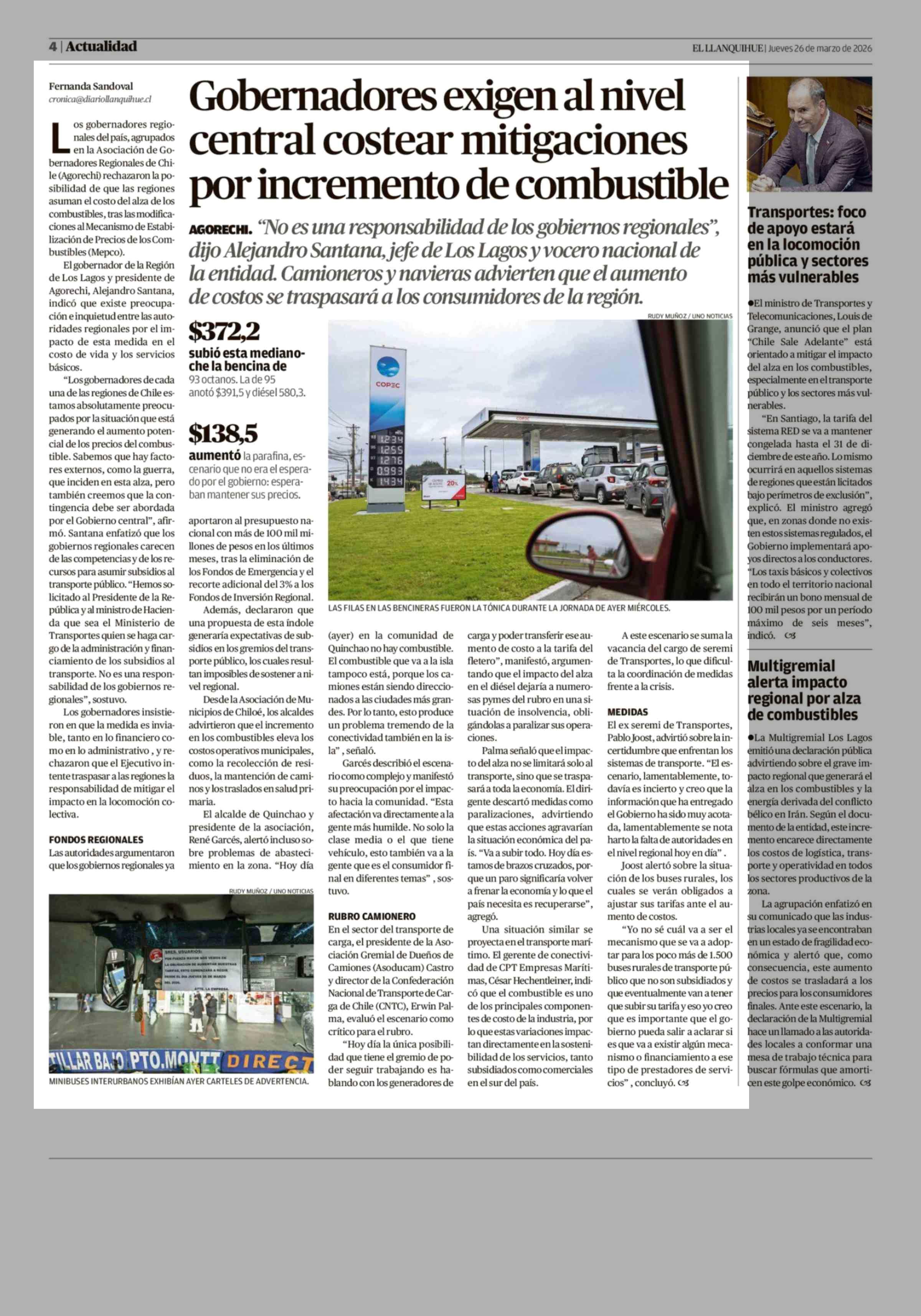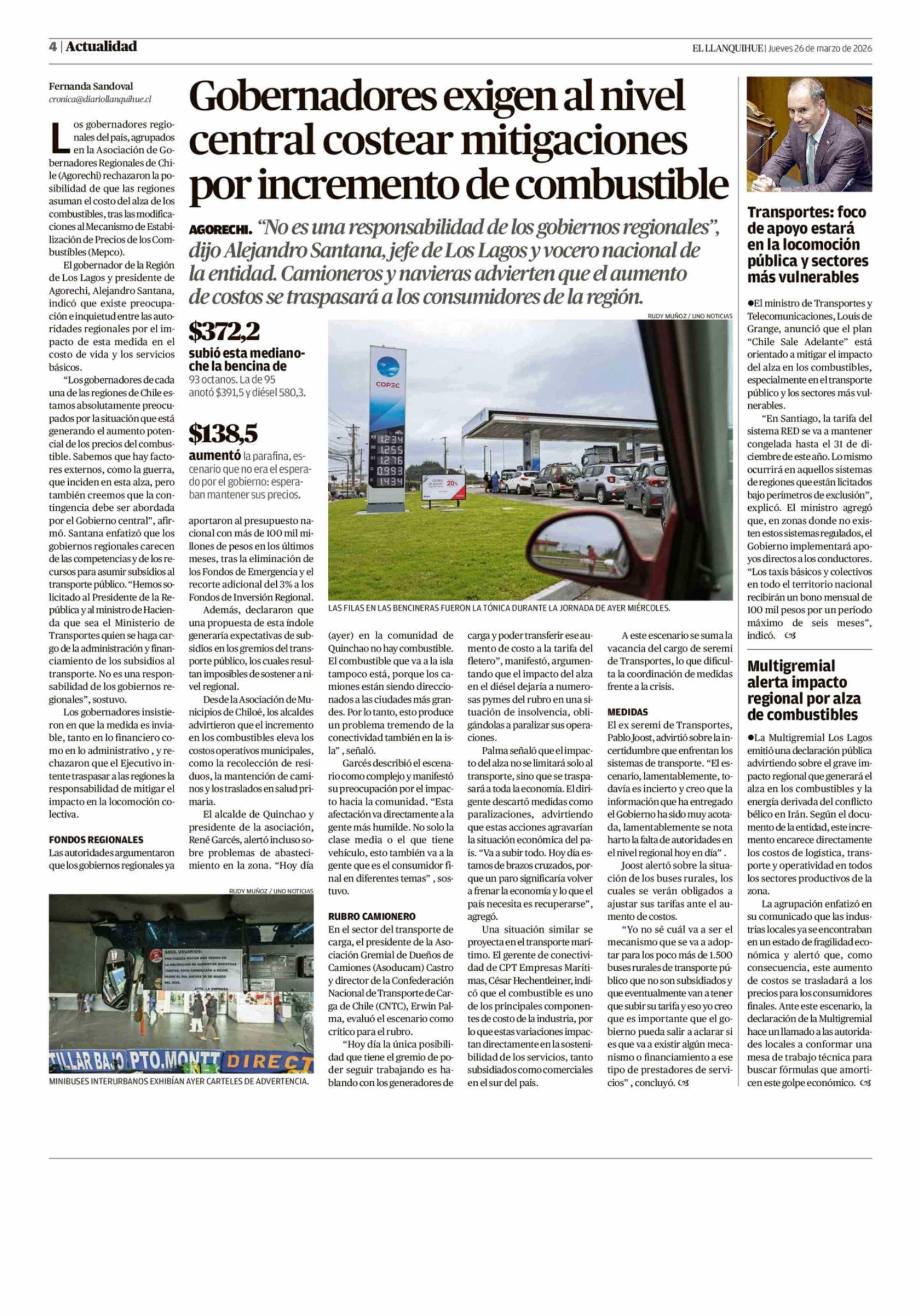 Gobernadores exigen al nivel central costear mitigaciones por incremento de combustible 26-03-2026 El Llanquihue |
