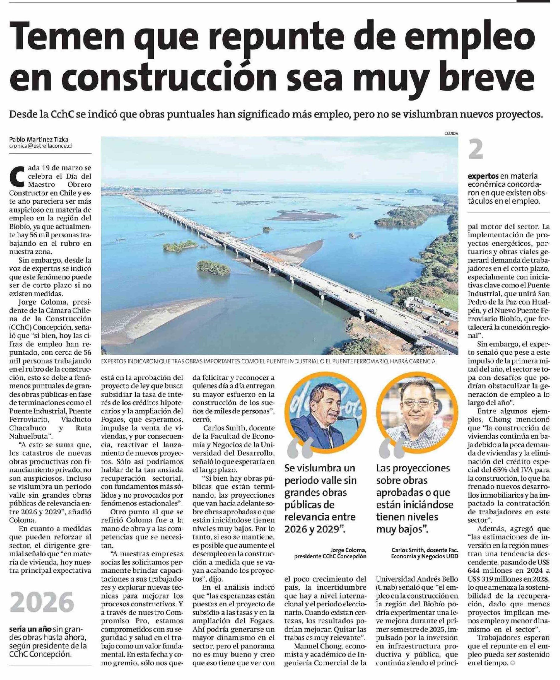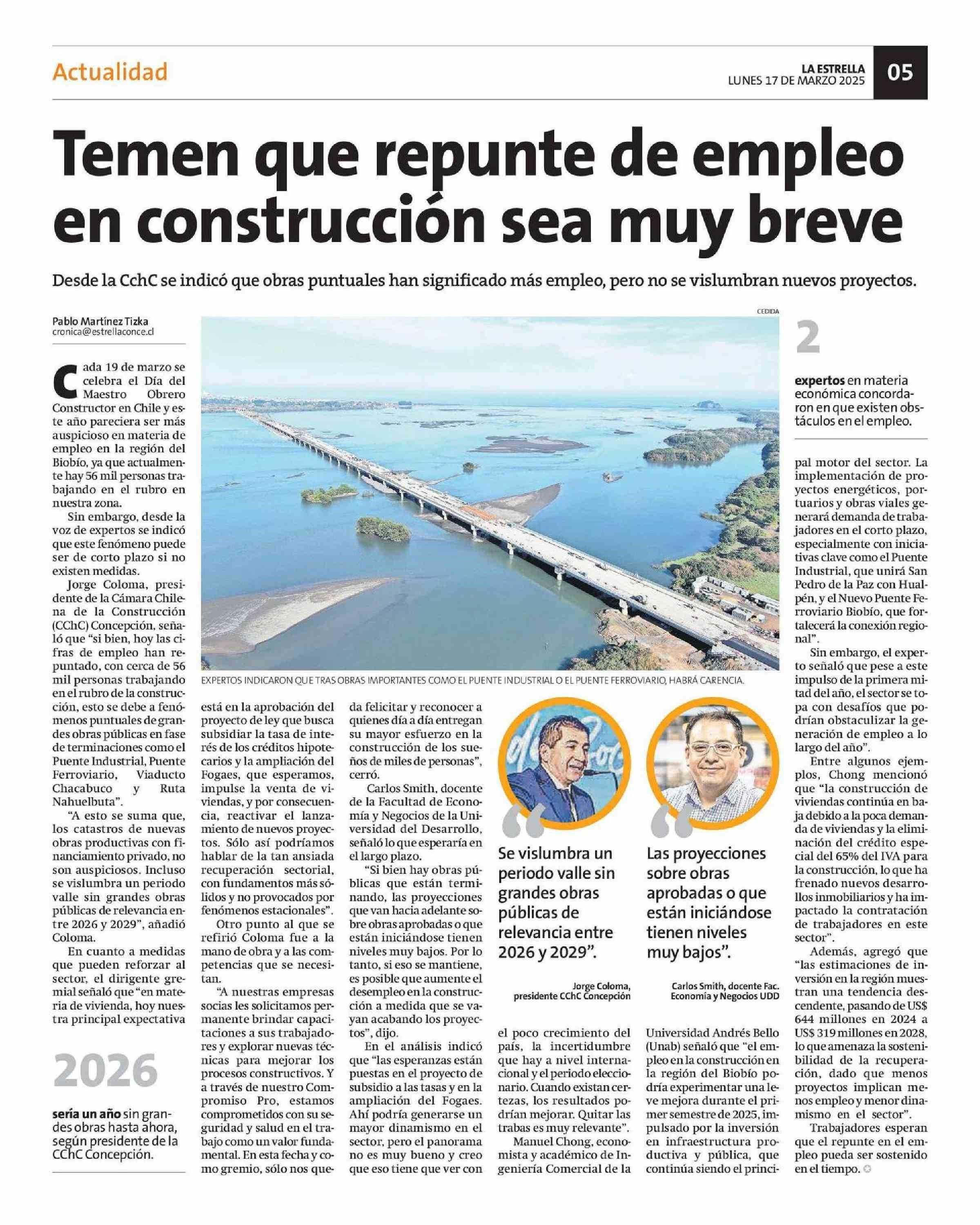 Temen que repunte de empleo en construcción sea muy breve 17-03-2025 La Estrella de Concepción |