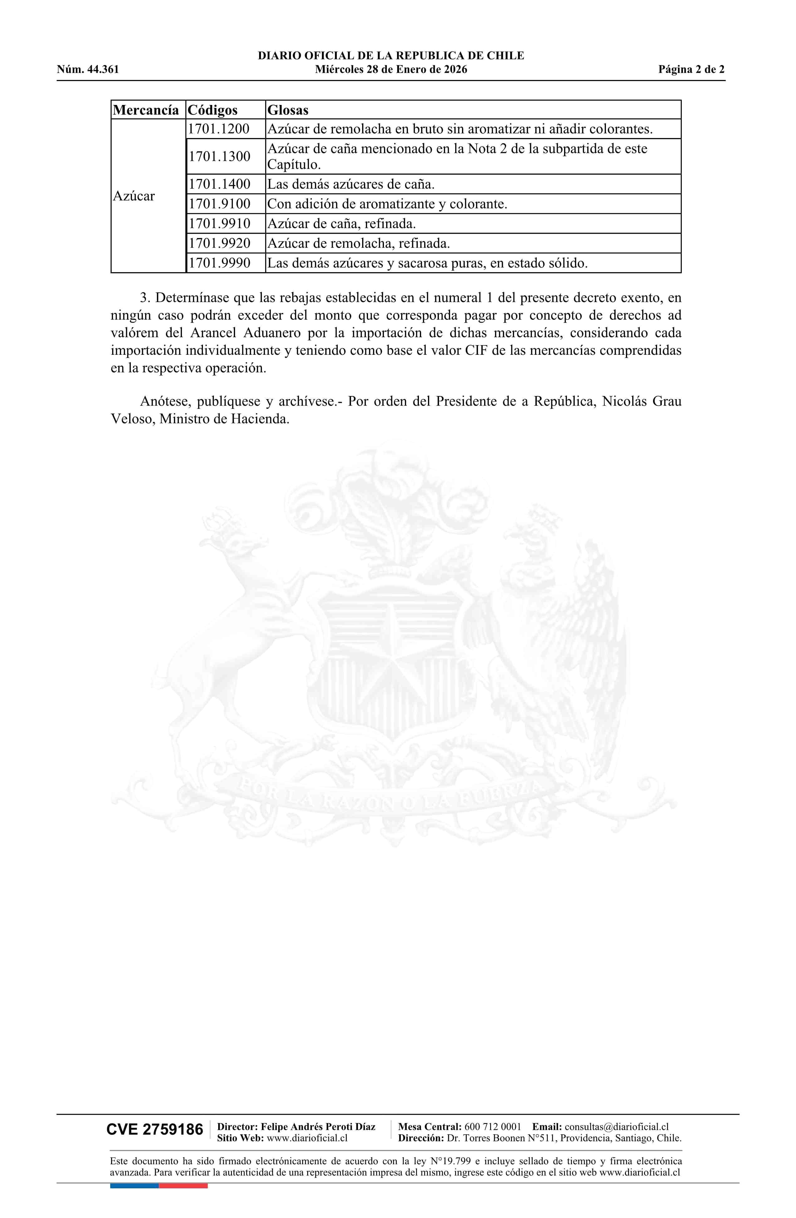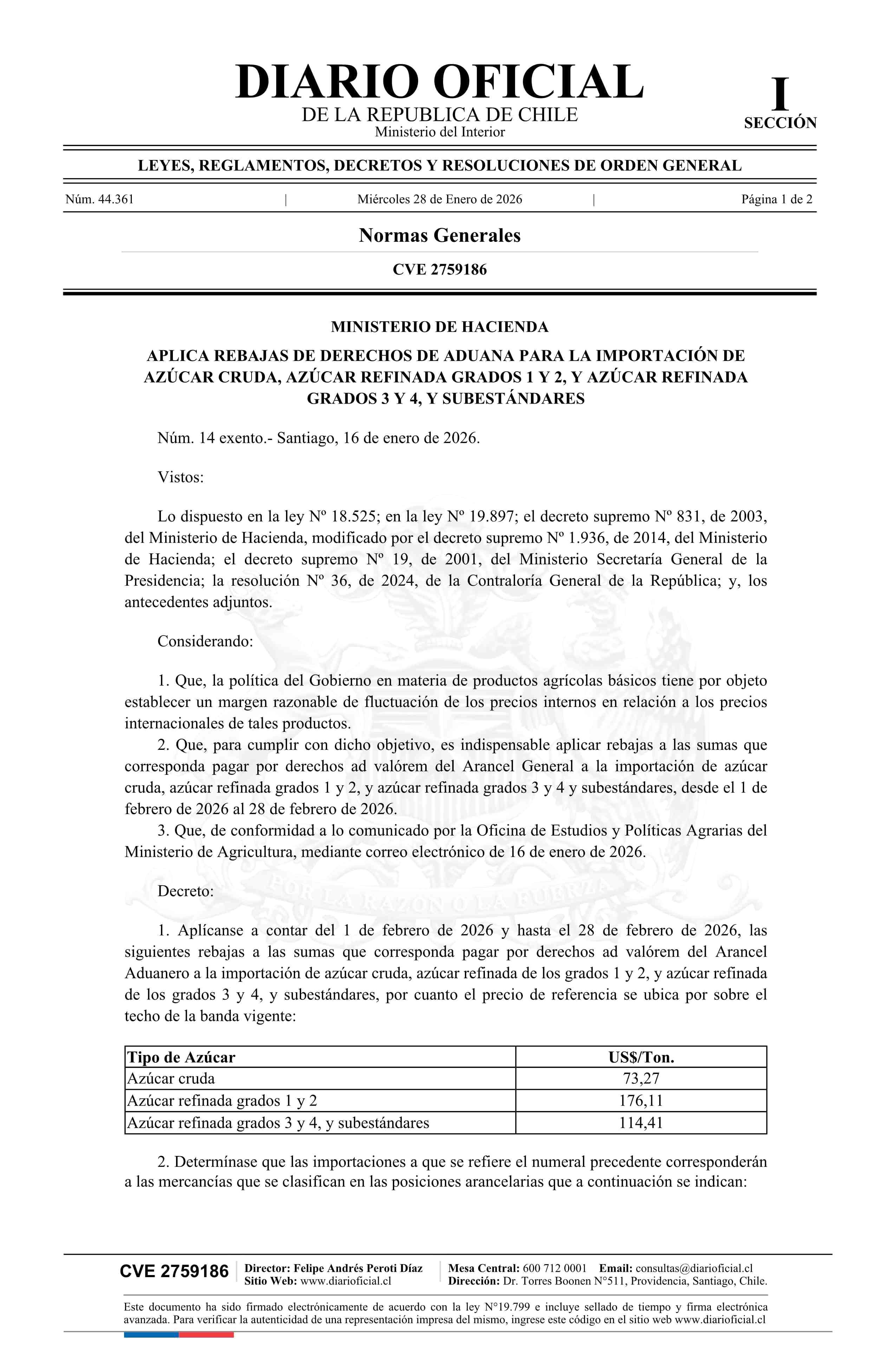 | Título: | Decreto exento número 14, de 2026.- Aplica rebajas de derechos de aduana para la importación de azúcar cruda, azúcar refinada grados 1 y 2, y azúcar refinada grados 3 y 4, y subestándares |