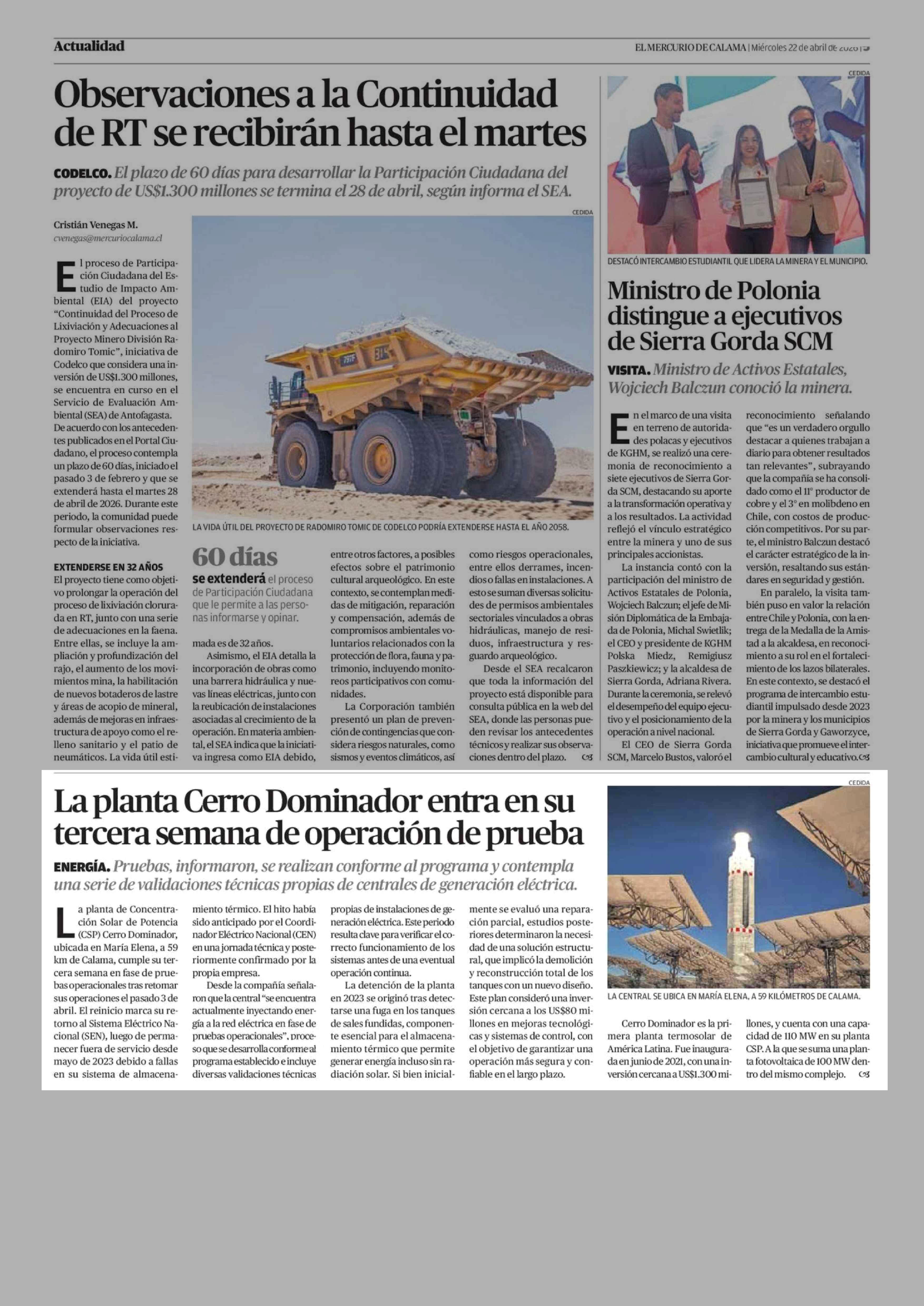 La planta Cerro Dominador entra en su tercera semana de operación de prueba 22-04-2026 El Mercurio de Calama |
