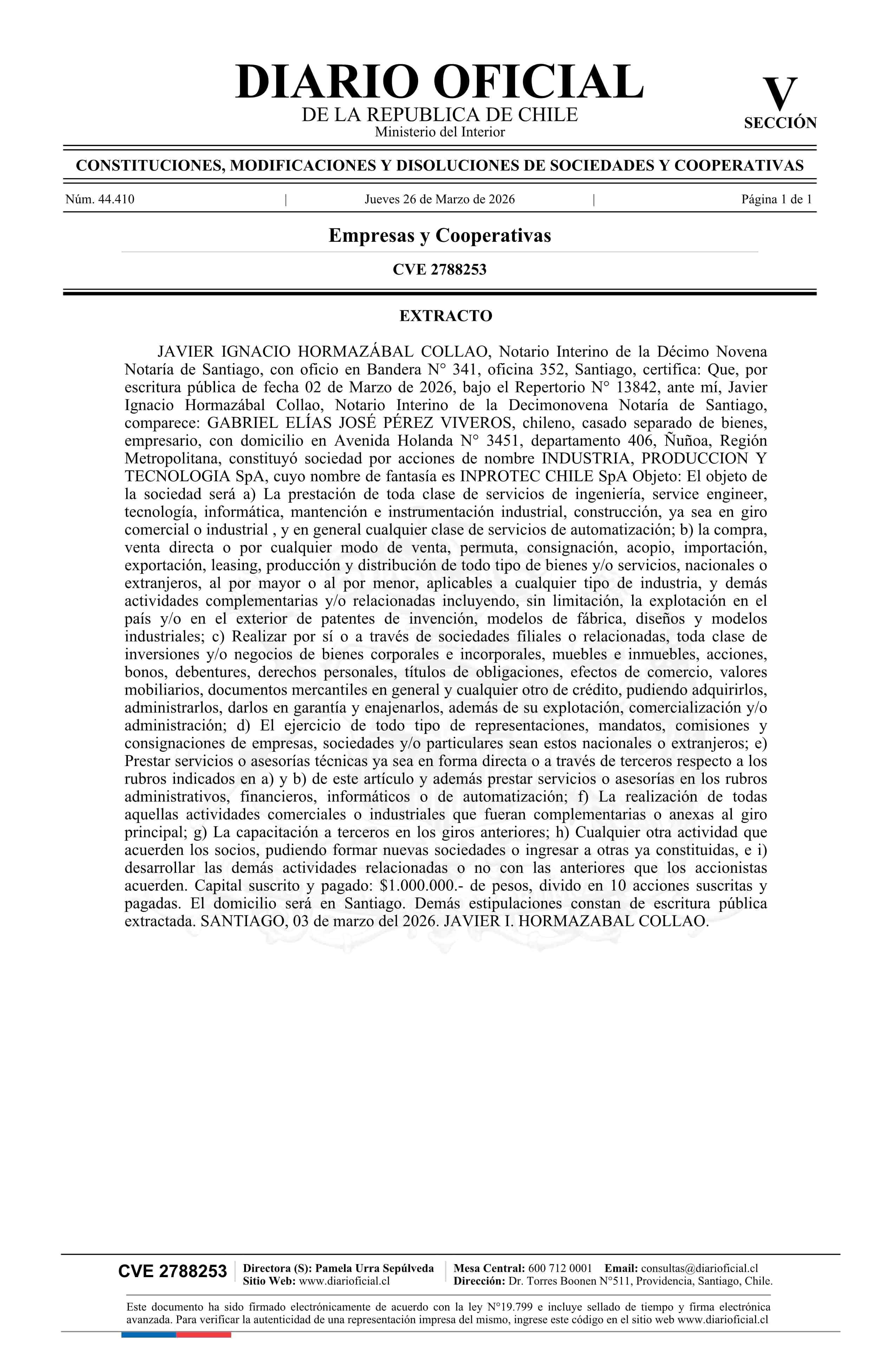 INDUSTRIA, PRODUCCION Y TECNOLOGIA SpA 26-03-2026 Diario Oficial Edición Electrónica |