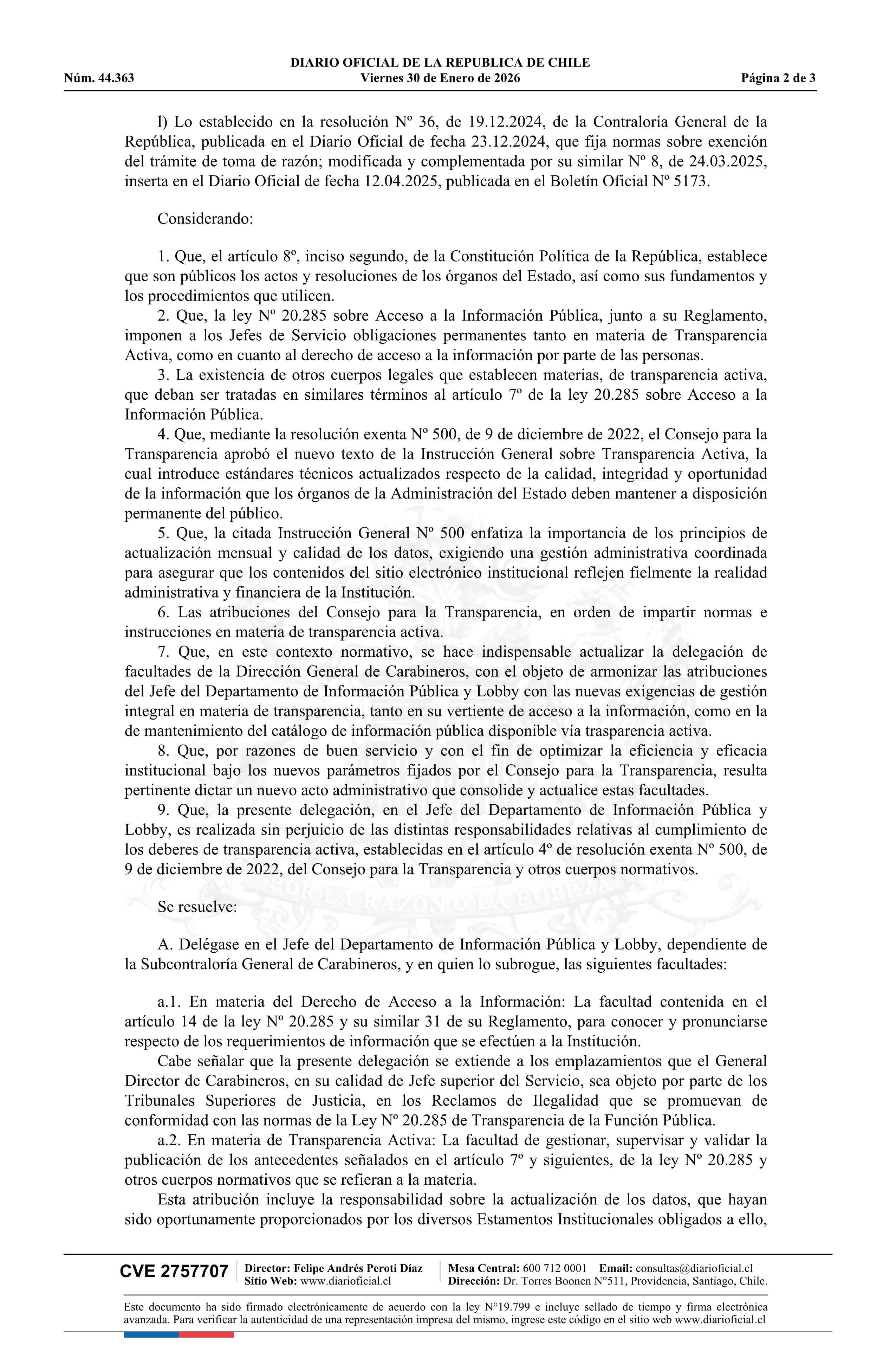 | Título: | Resolución exenta número 12, de 2026.- Delega facultades que indica en el Jefe del Departamento de Información Pública y Lobby y deja sin efecto acto administrativo que indica |