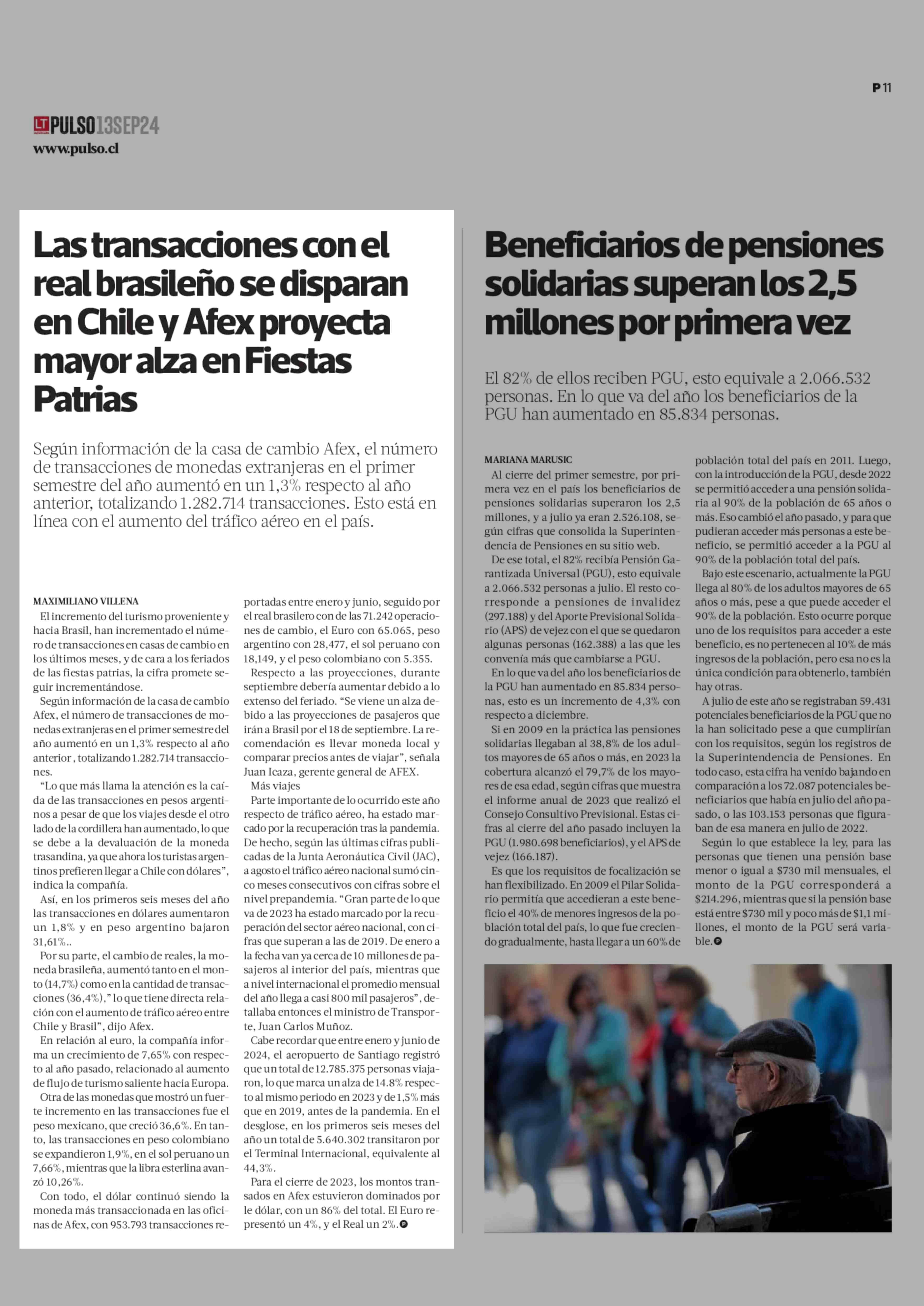 Las transacciones con el real brasileño se disparan en Chile y Afex proyecta mayor alza en Fiestas Patrias 13-09-2024 La Tercera |
