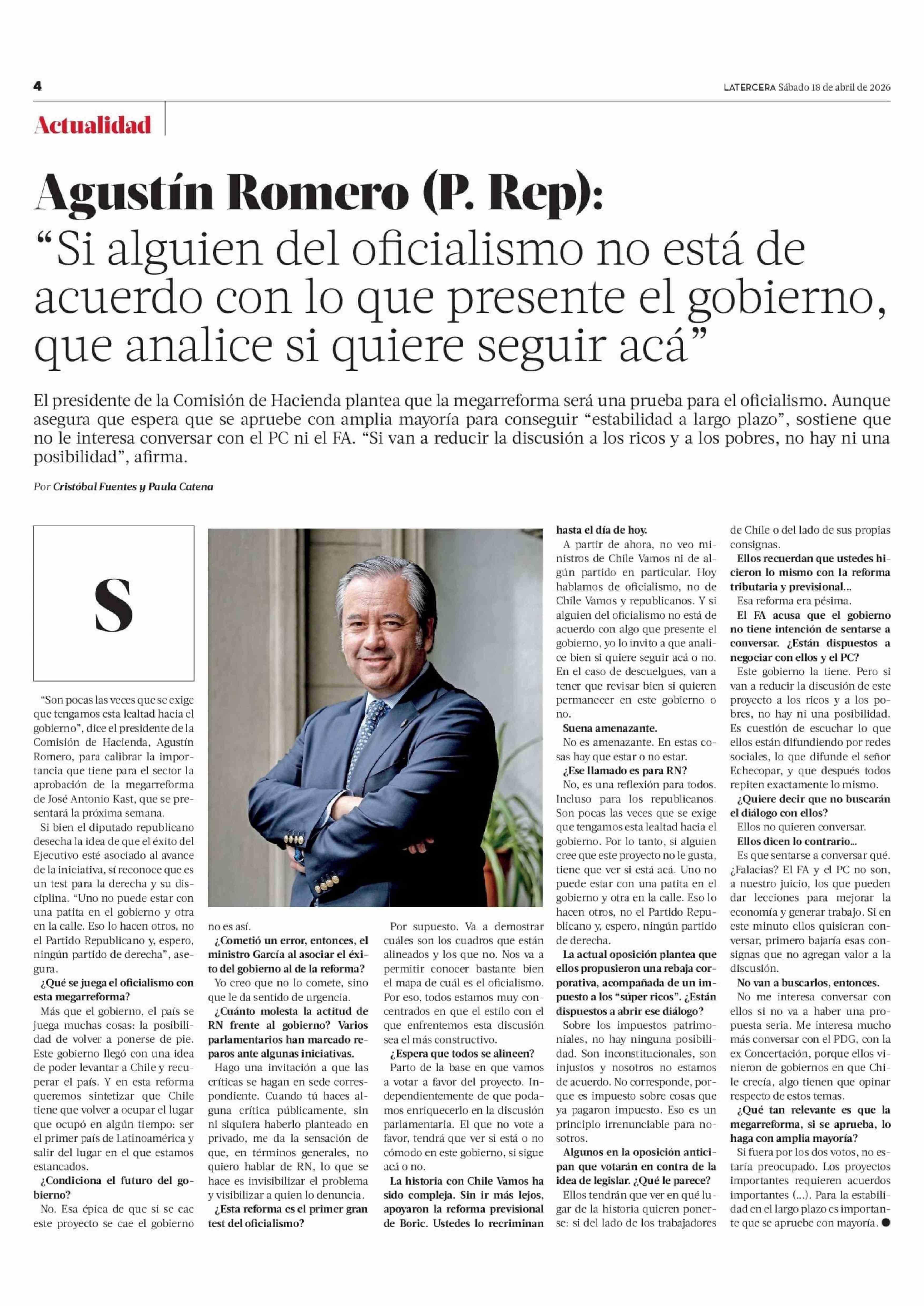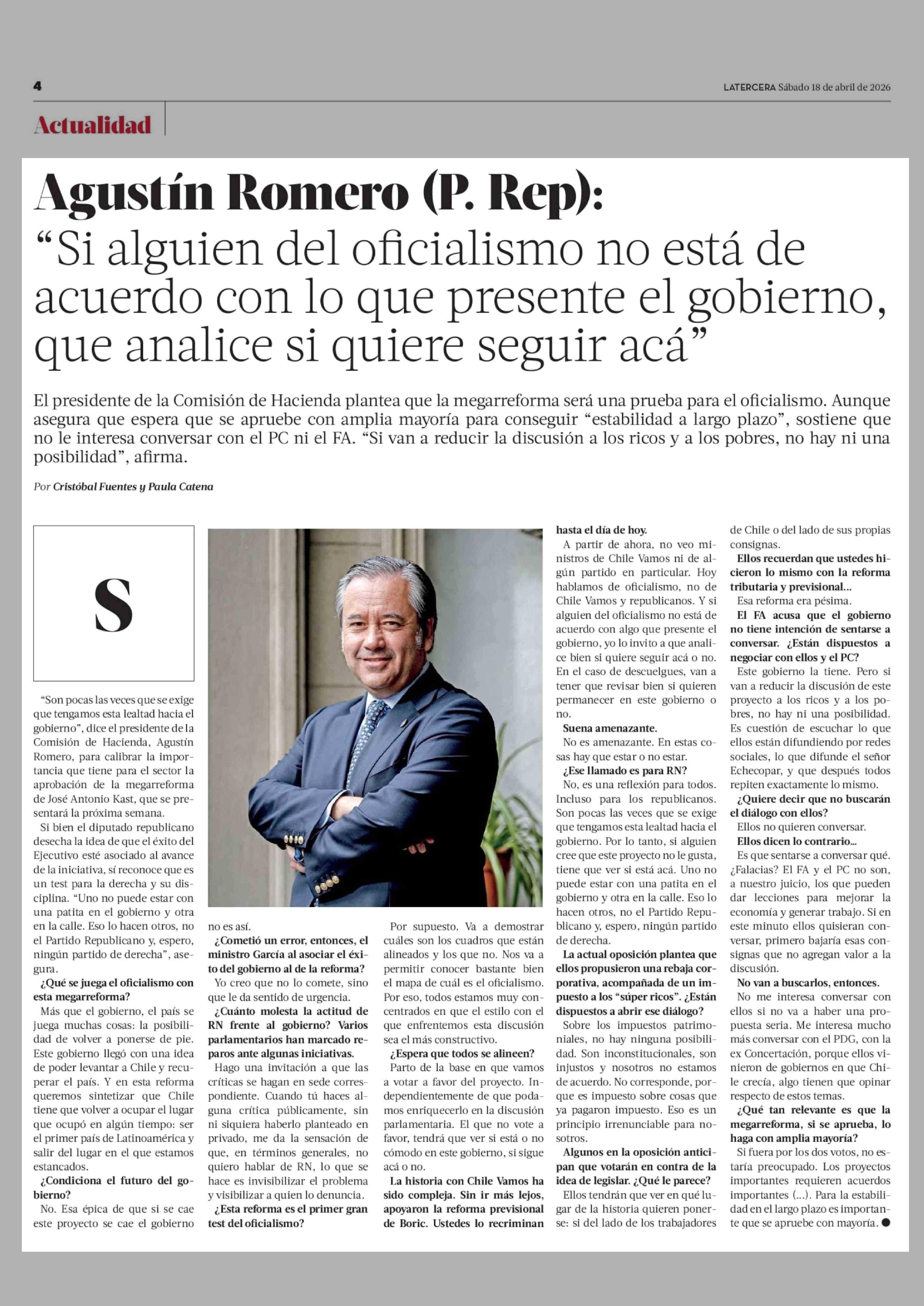 Agustín Romero (P. Rep): "Si alguien del oficialismo no está de acuerdo con lo que presente el gobierno, que analice si quiere seguir acá' 18-04-2026 La Tercera |