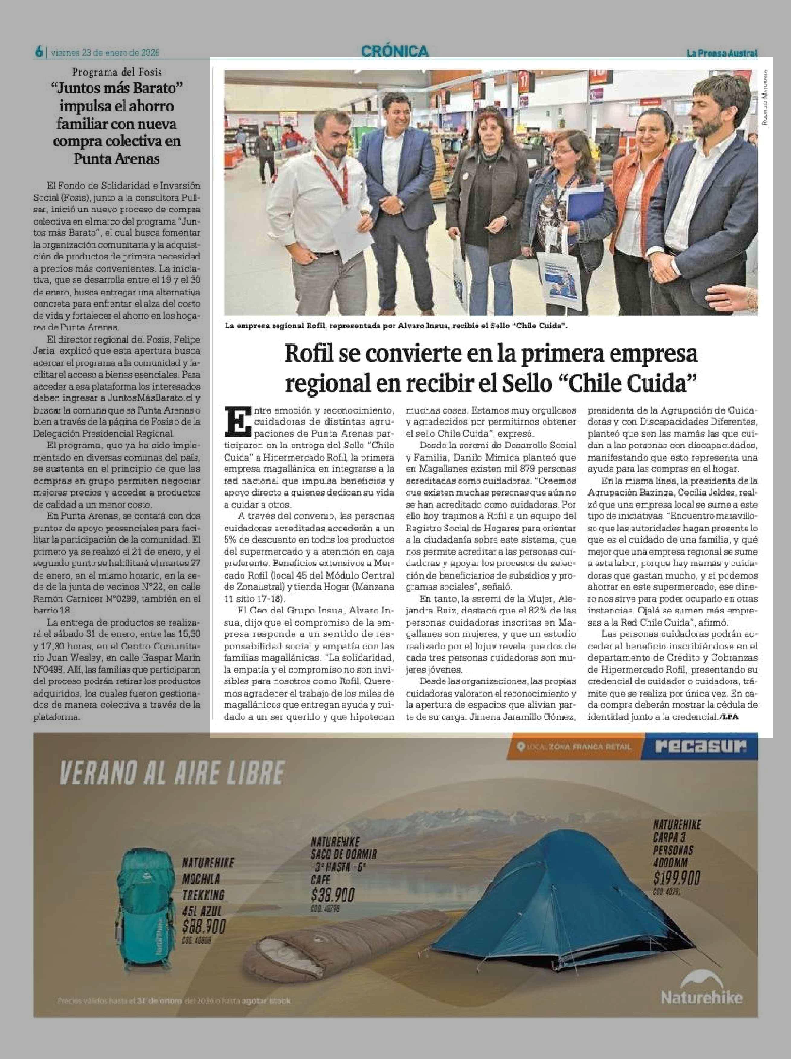 Rofil se convierte en la primera empresa regional en recibir el Sello "Chile Cuida" 23-01-2026 La Prensa Austral |
