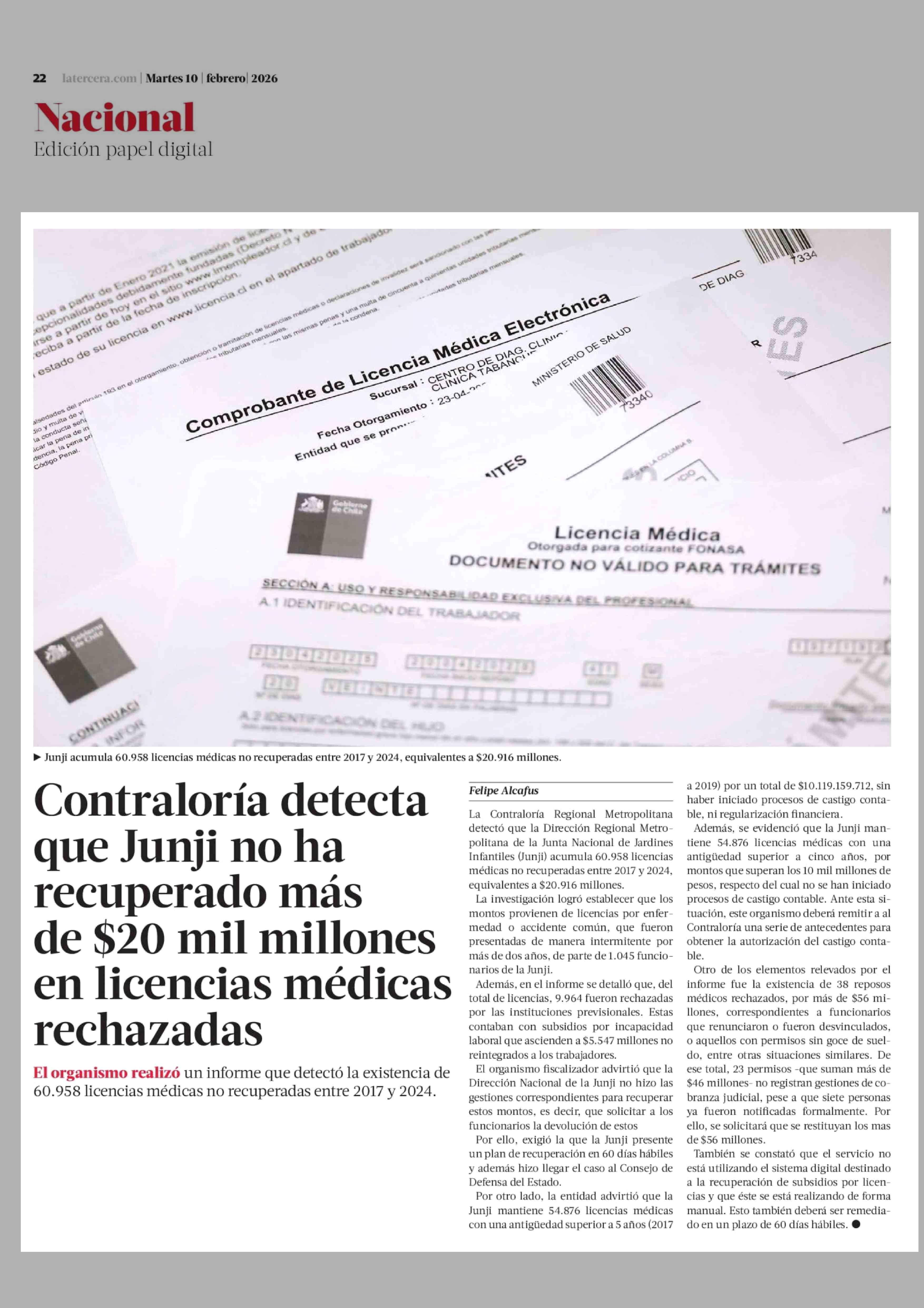Contraloría detecta que Junji no ha recuperado más de $20 mil millones en licencias médicas rechazadas 10-02-2026 La Tercera |
