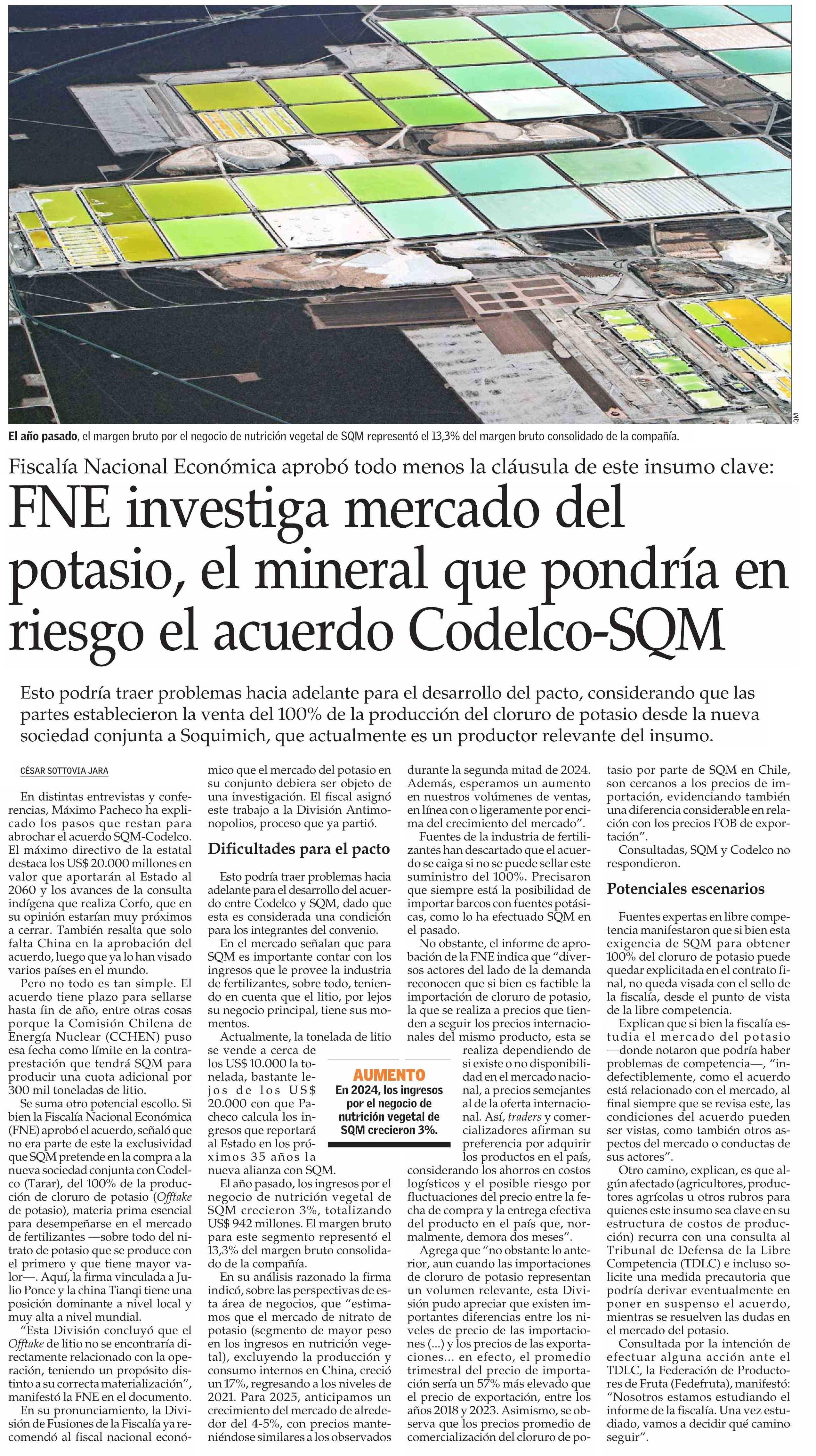 | Título: | FNE investiga mercado del potasio, el mineral que pondría en riesgo el acuerdo Codelco-SQM |