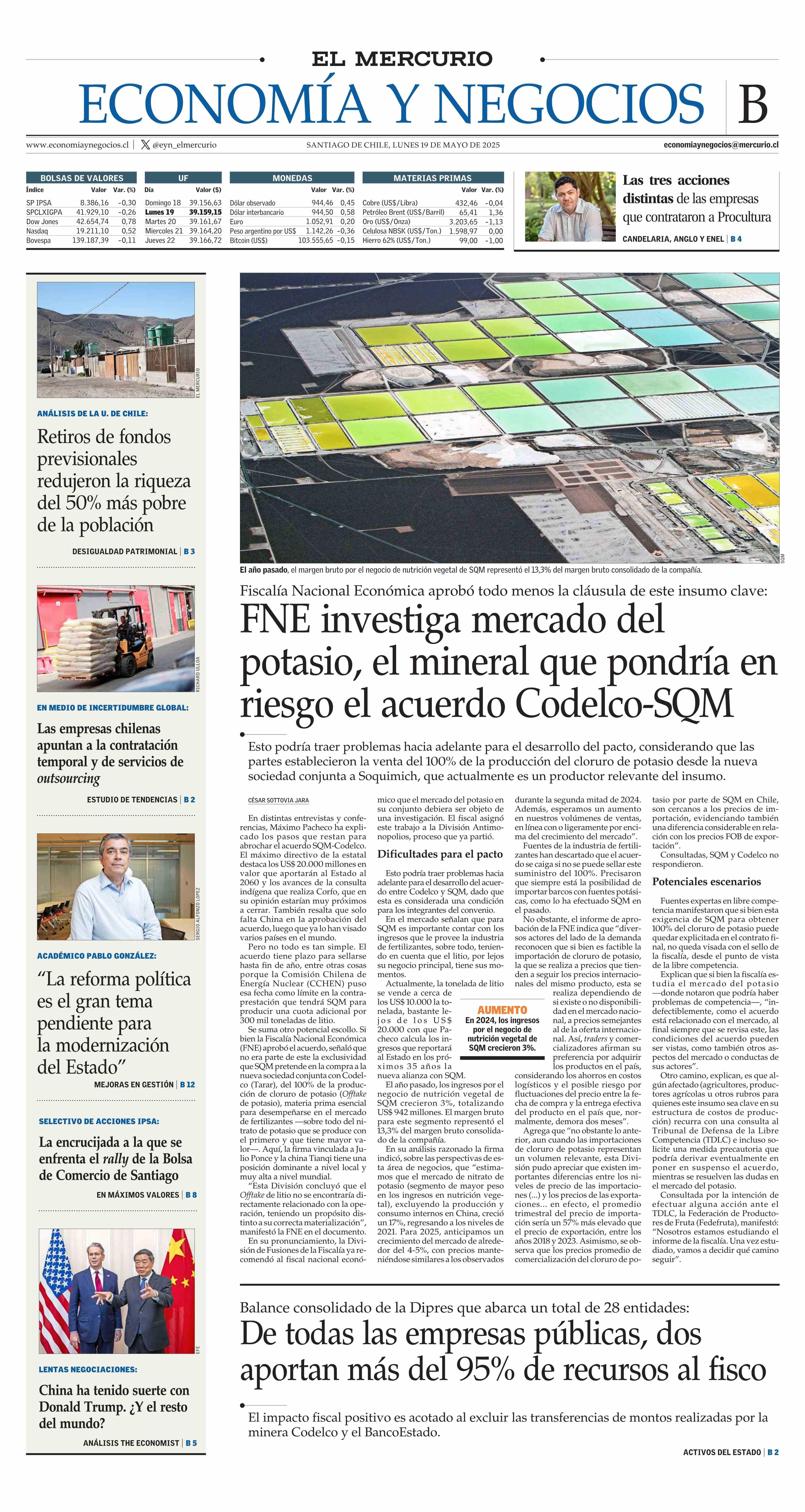 FNE investiga mercado del potasio, el mineral que pondría en riesgo el acuerdo Codelco-SQM 19-05-2025 El Mercurio |