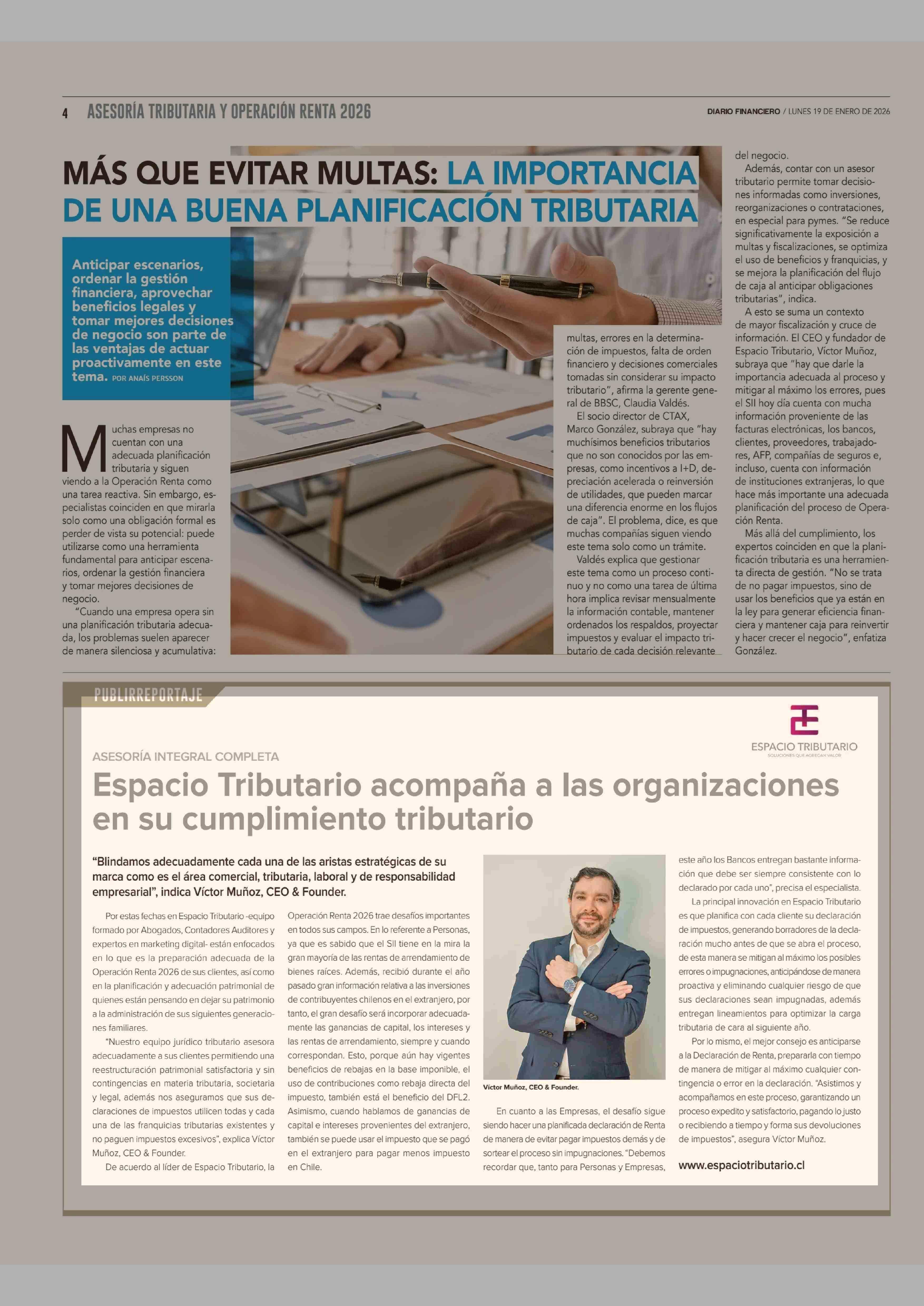 Espacio Tributario acompaña a las organizaciones en su cumplimiento tributario 19-01-2026 Diario Financiero |