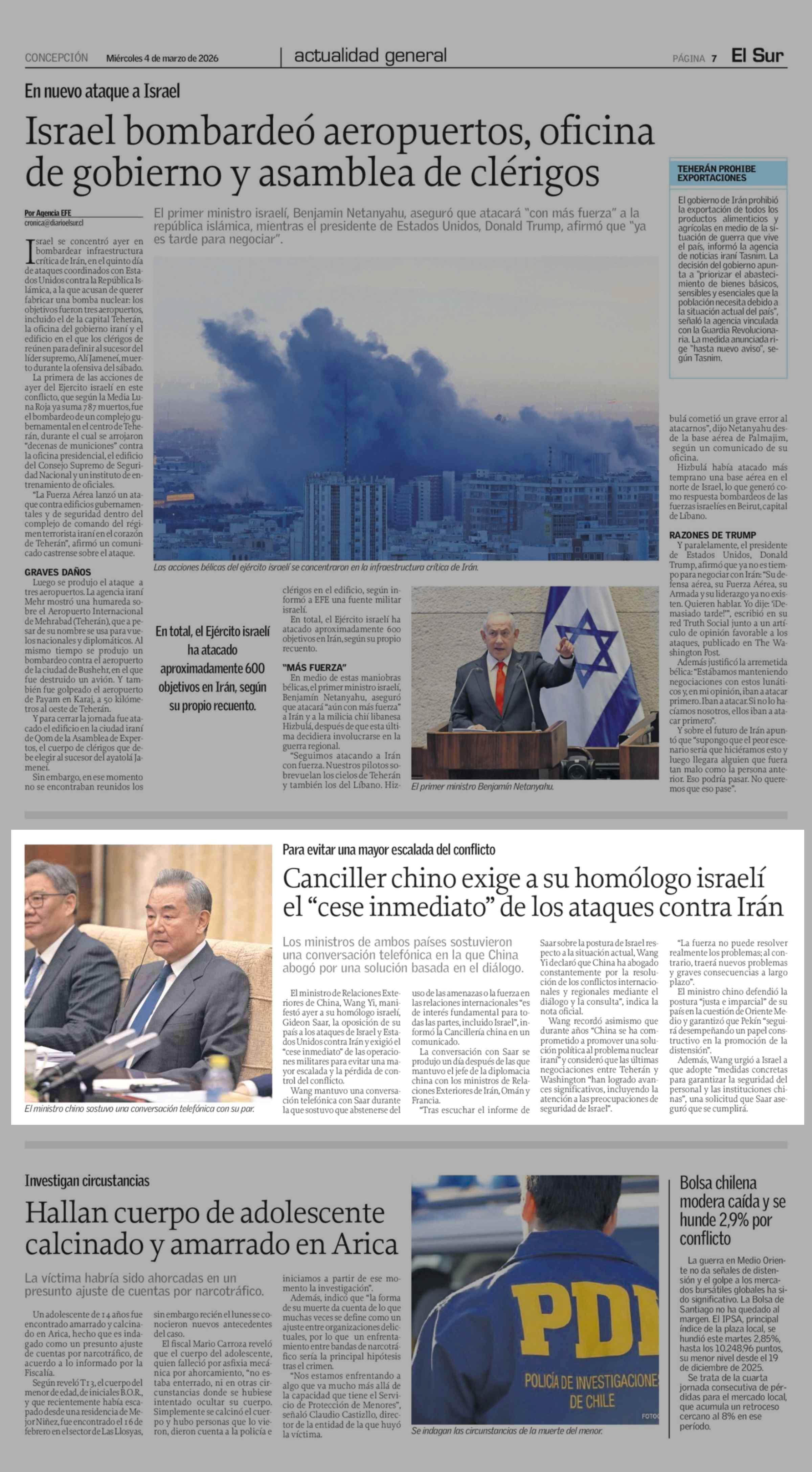 Canciller chino exige a su homólogo israelí el "cese inmediato" de los ataques contra Irán 04-03-2026 El Sur |