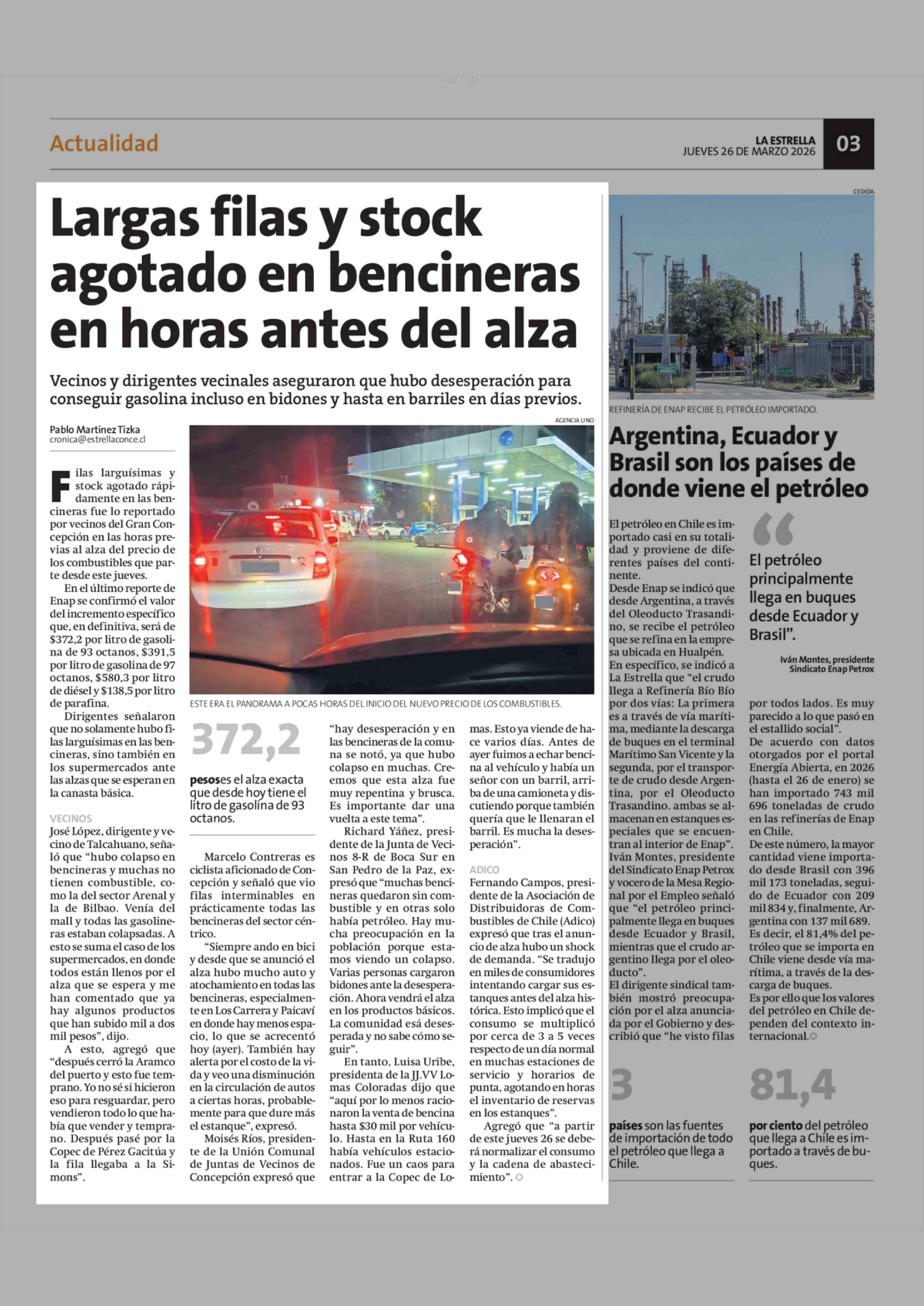 Largas filas y stock agotado en bencineras en horas antes del alza 26-03-2026 La Estrella de Concepción |