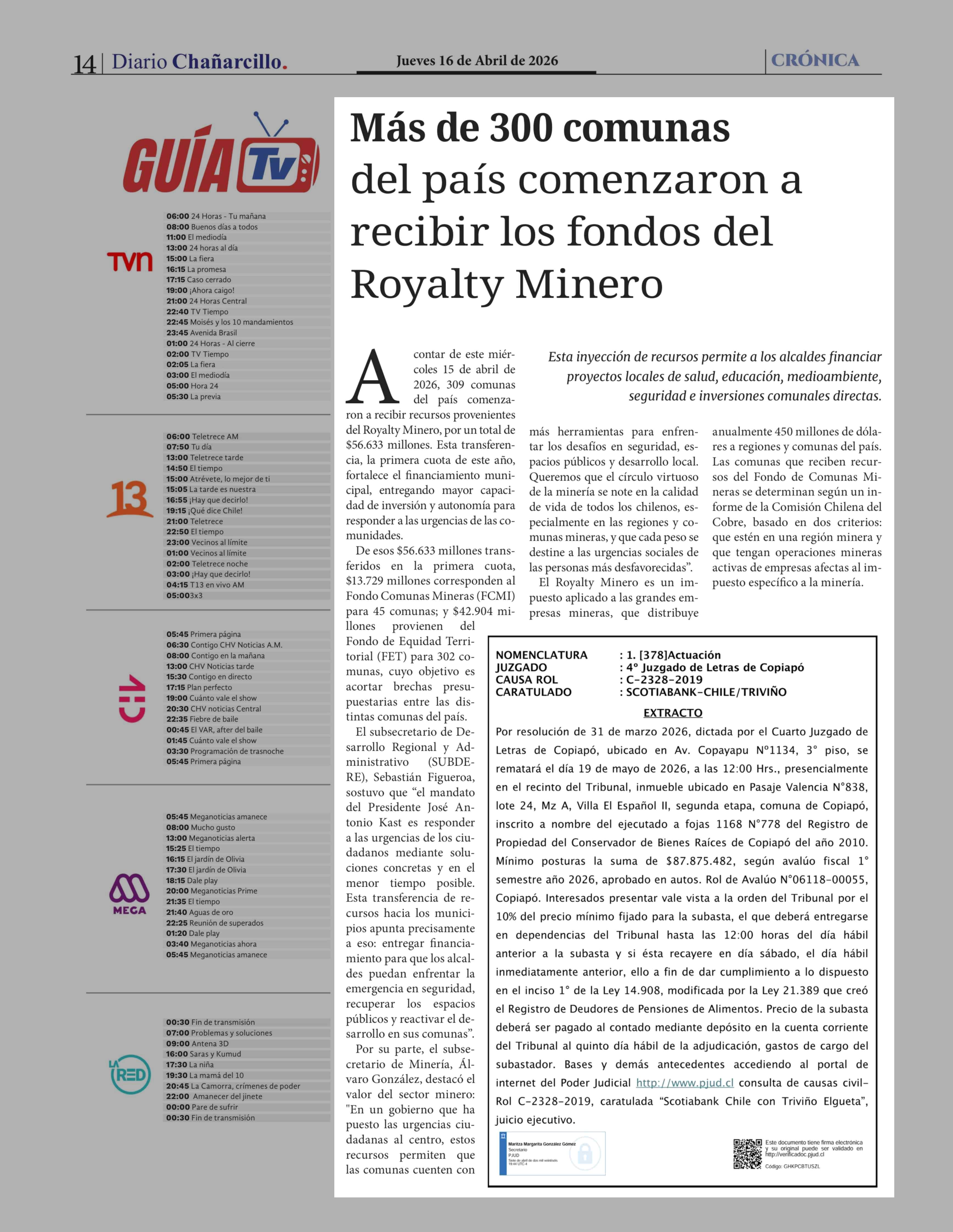 Más de 300 comunas del país comenzaron a recibir los fondos del Royalty Minero 16-04-2026 Diario Chañarcillo |