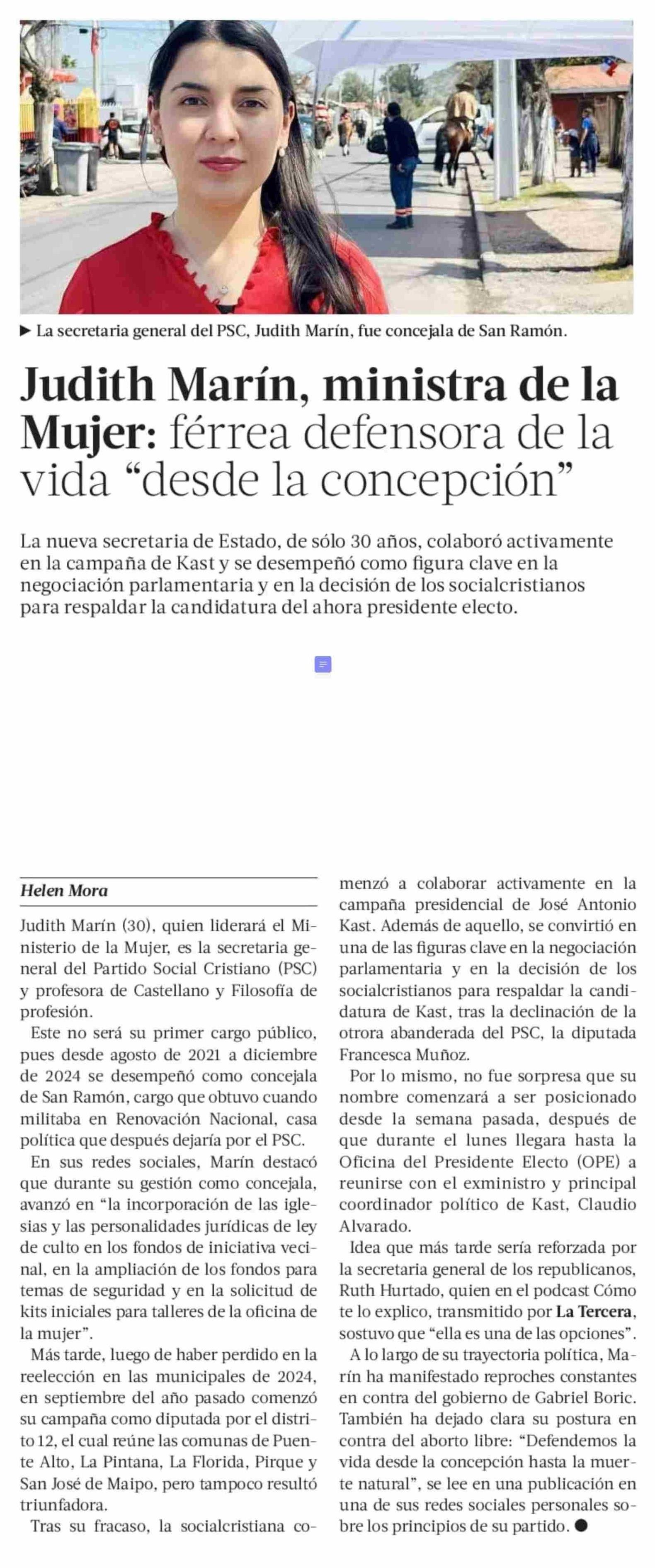 Título: Judith Marín, ministra de la Mujer: férrea defensora de la vida "desde la concepción"