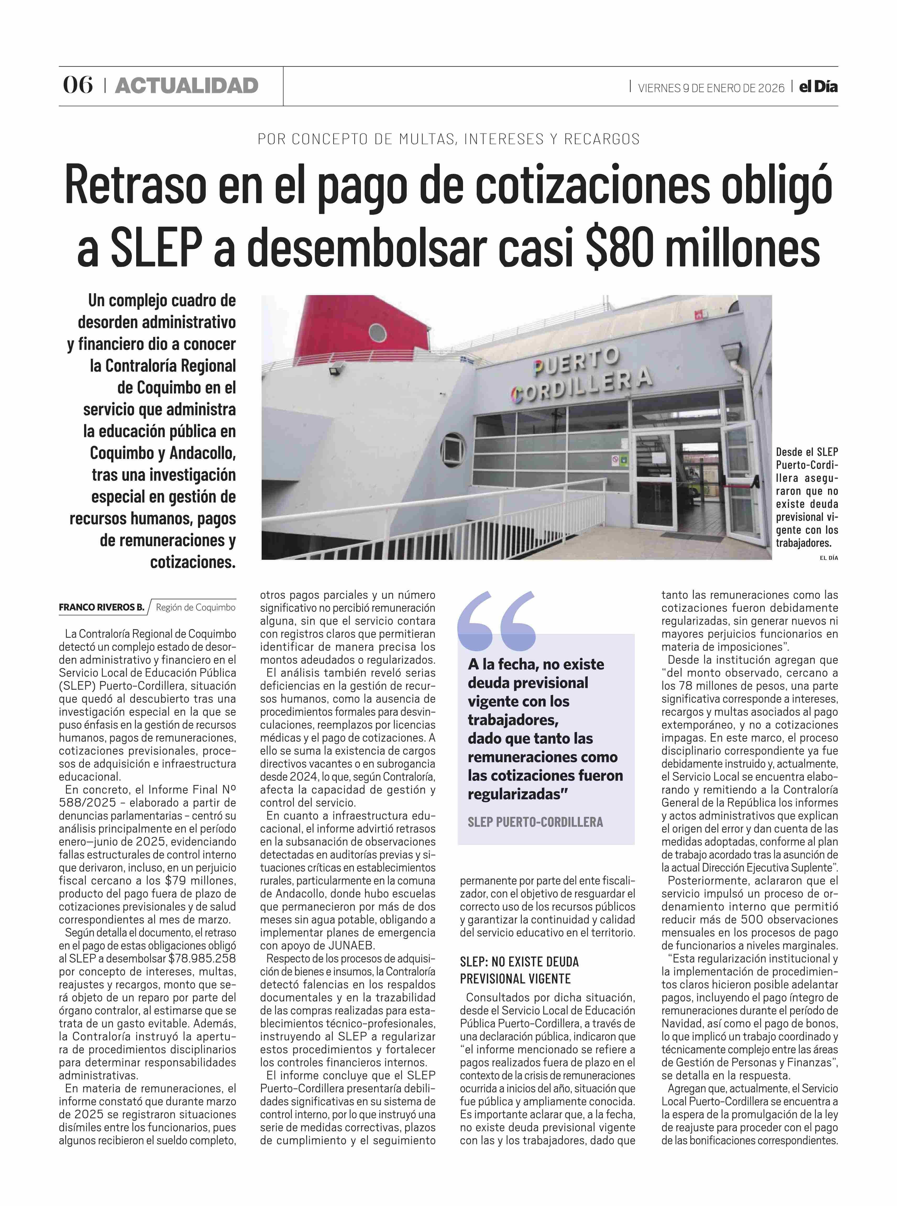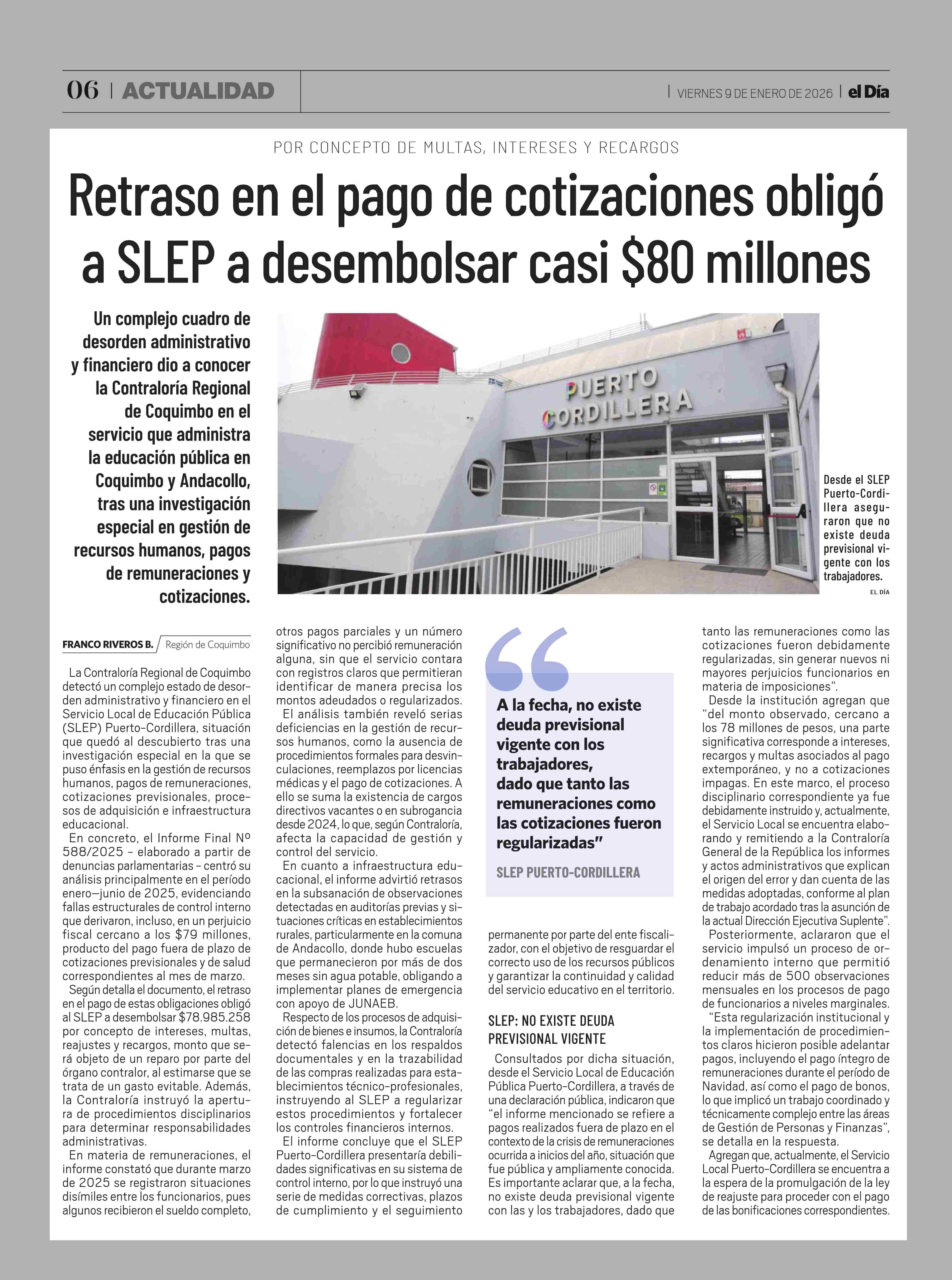 Retraso en el pago de cotizaciones obligó a SLEP a desembolsar casi $80 millones 09-01-2026 El Día |