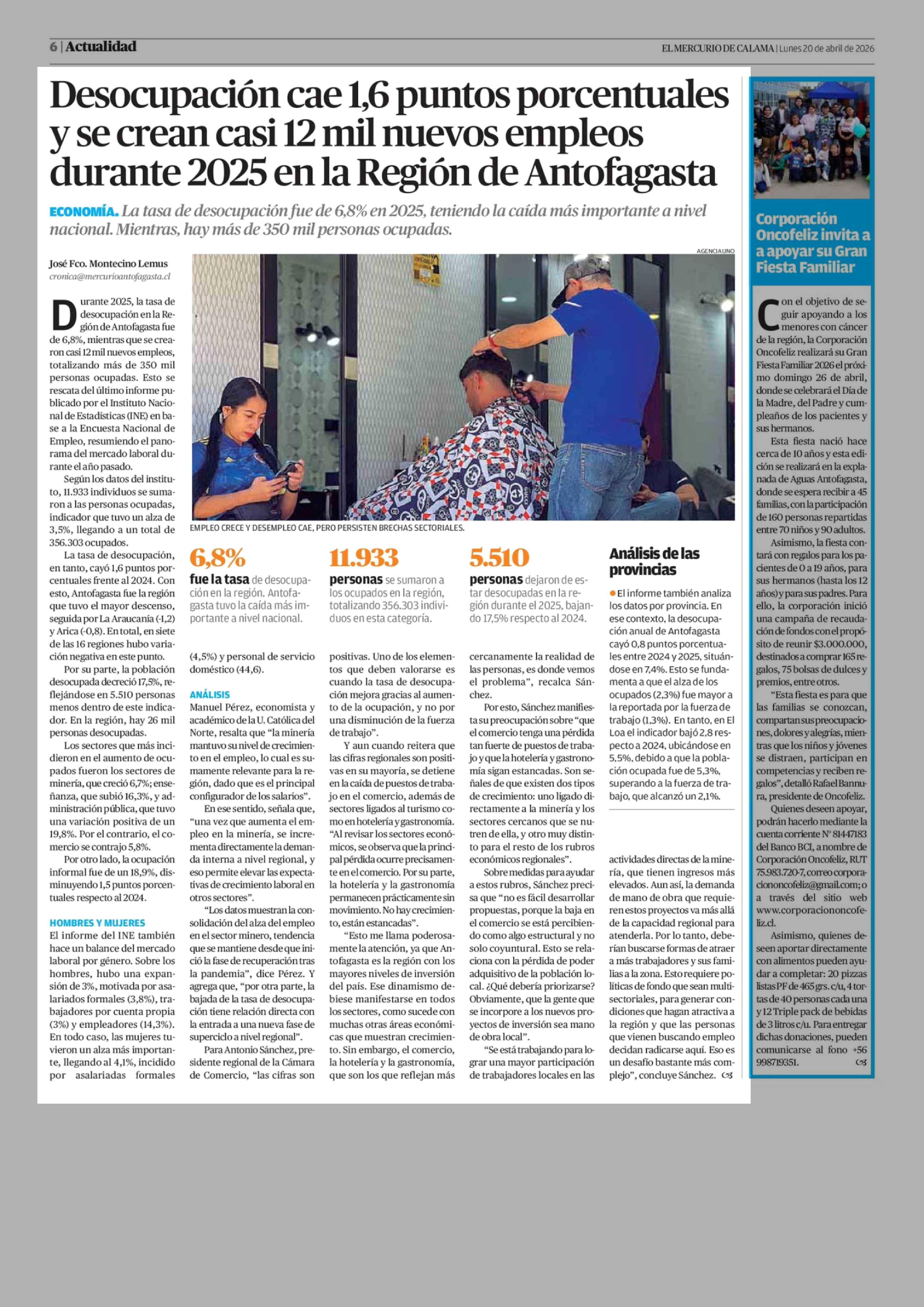 Desocupación cae 1,6 puntos porcentuales y se crean casi 12 mil nuevos empleos durante 2025 en la Región de Antofagasta 20-04-2026 El Mercurio de Calama |