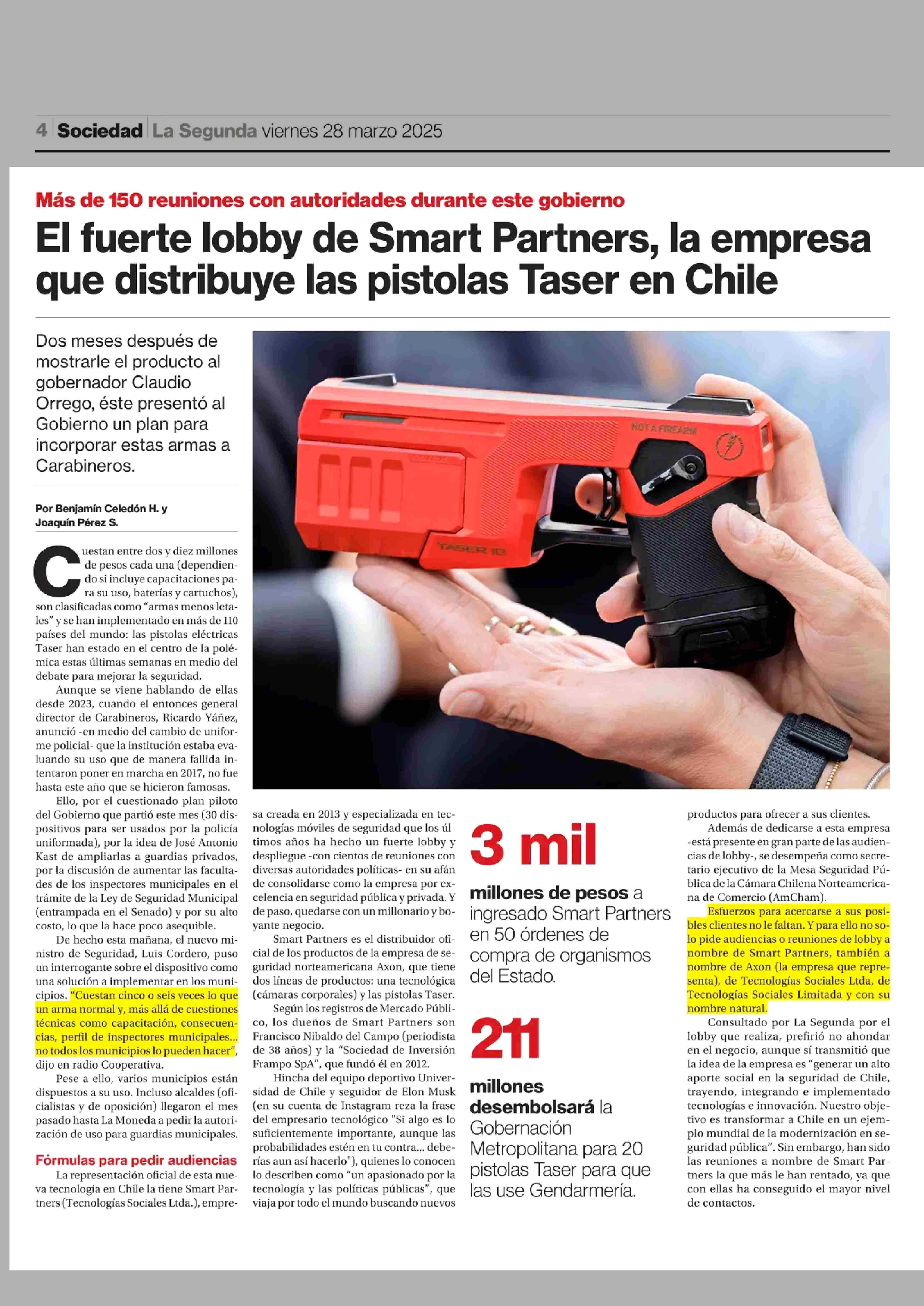 El fuerte lobby de Smart Partners, la empresa que distribuye las pistolas Taser en Chile 28-03-2025 La Segunda |