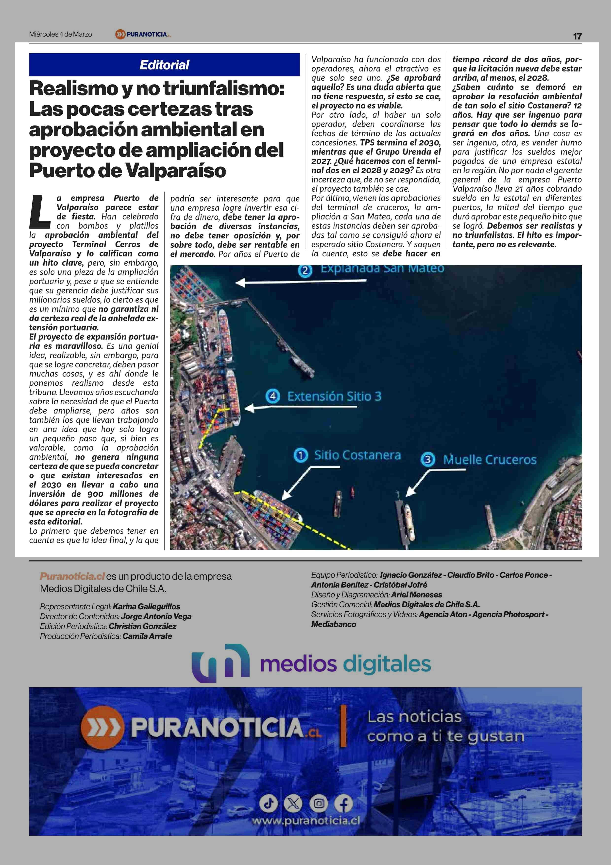 EDITORIAL: Las pocas certezas tras aprobación ambiental en proyecto de ampliación del Puerto de Valparaíso 04-03-2026 Puranoticia.cl |