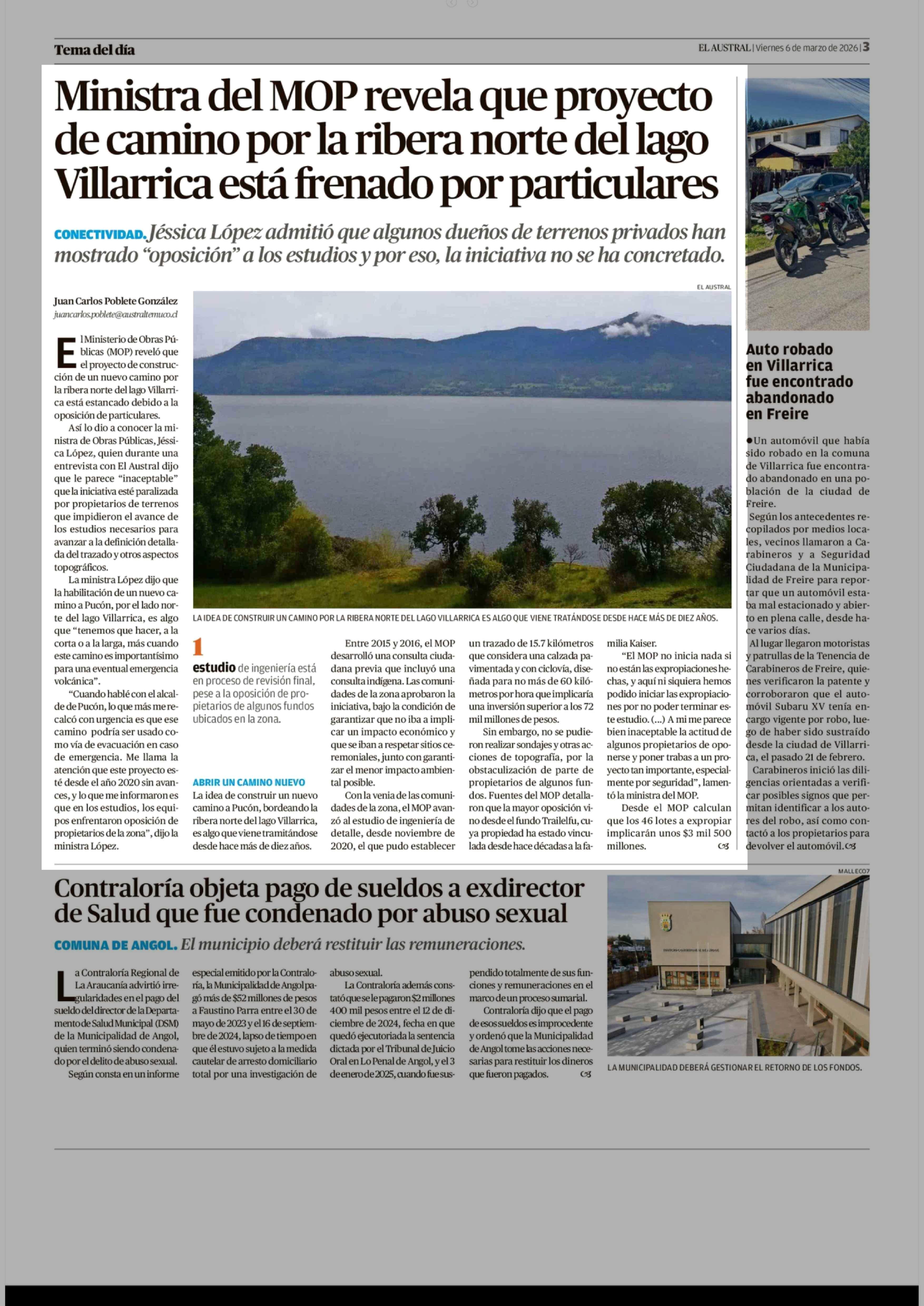 Título: Ministra del MOP revela que proyecto de camino por la ribera norte del lago Villarrica está frenado por particulares