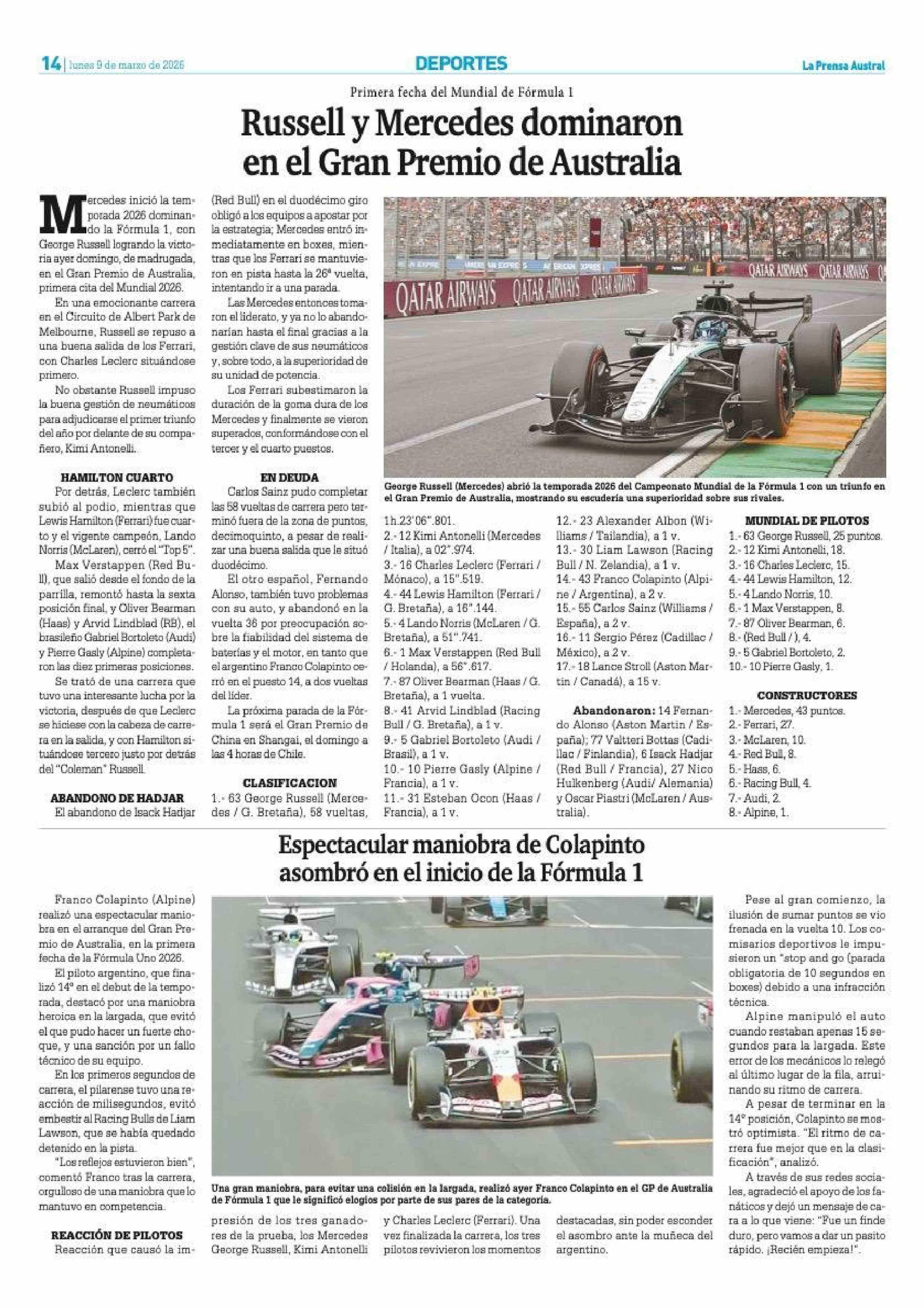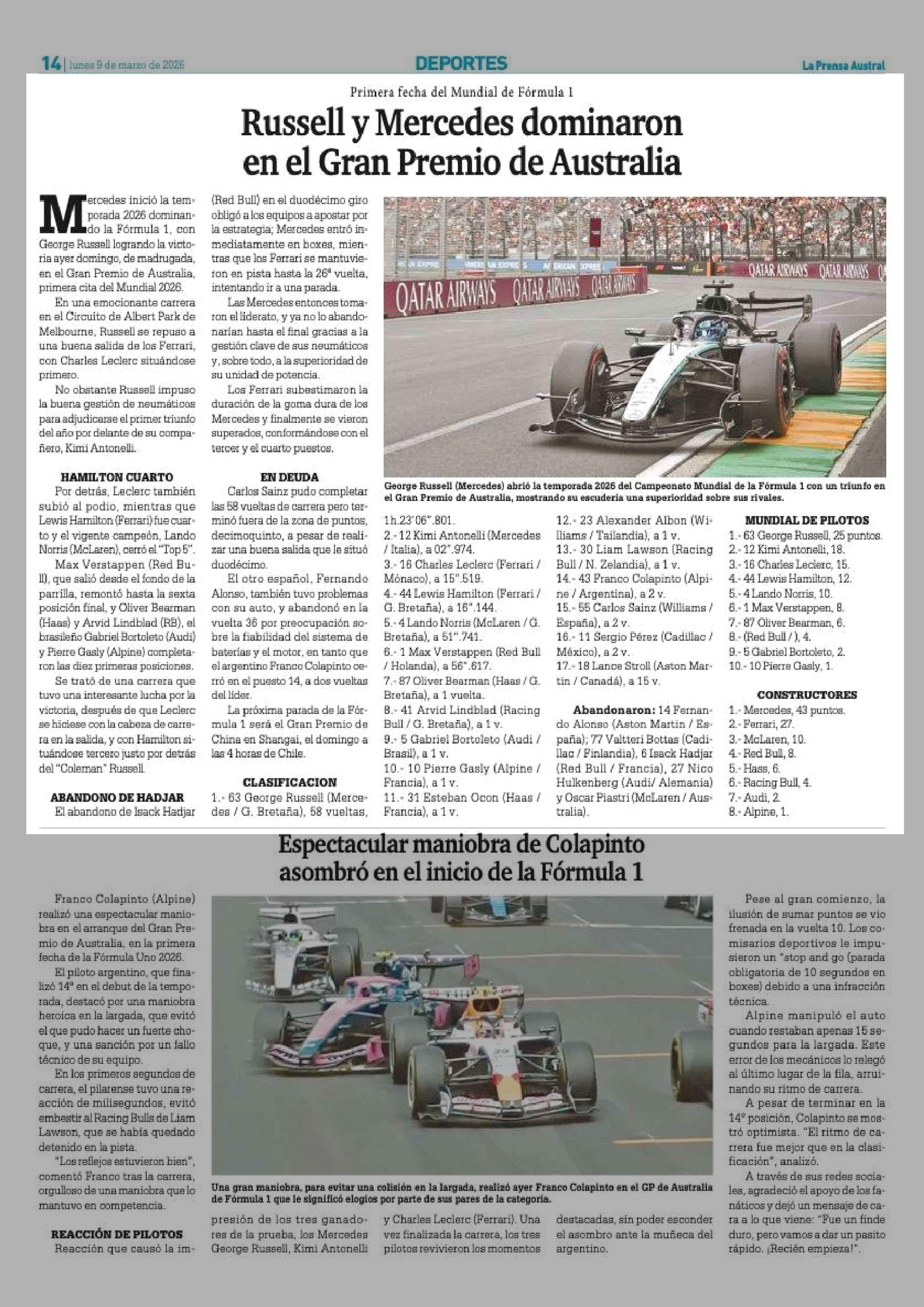 Russell y Mercedes dominaron en el Gran Premio de Australia 09-03-2026 La Prensa Austral |