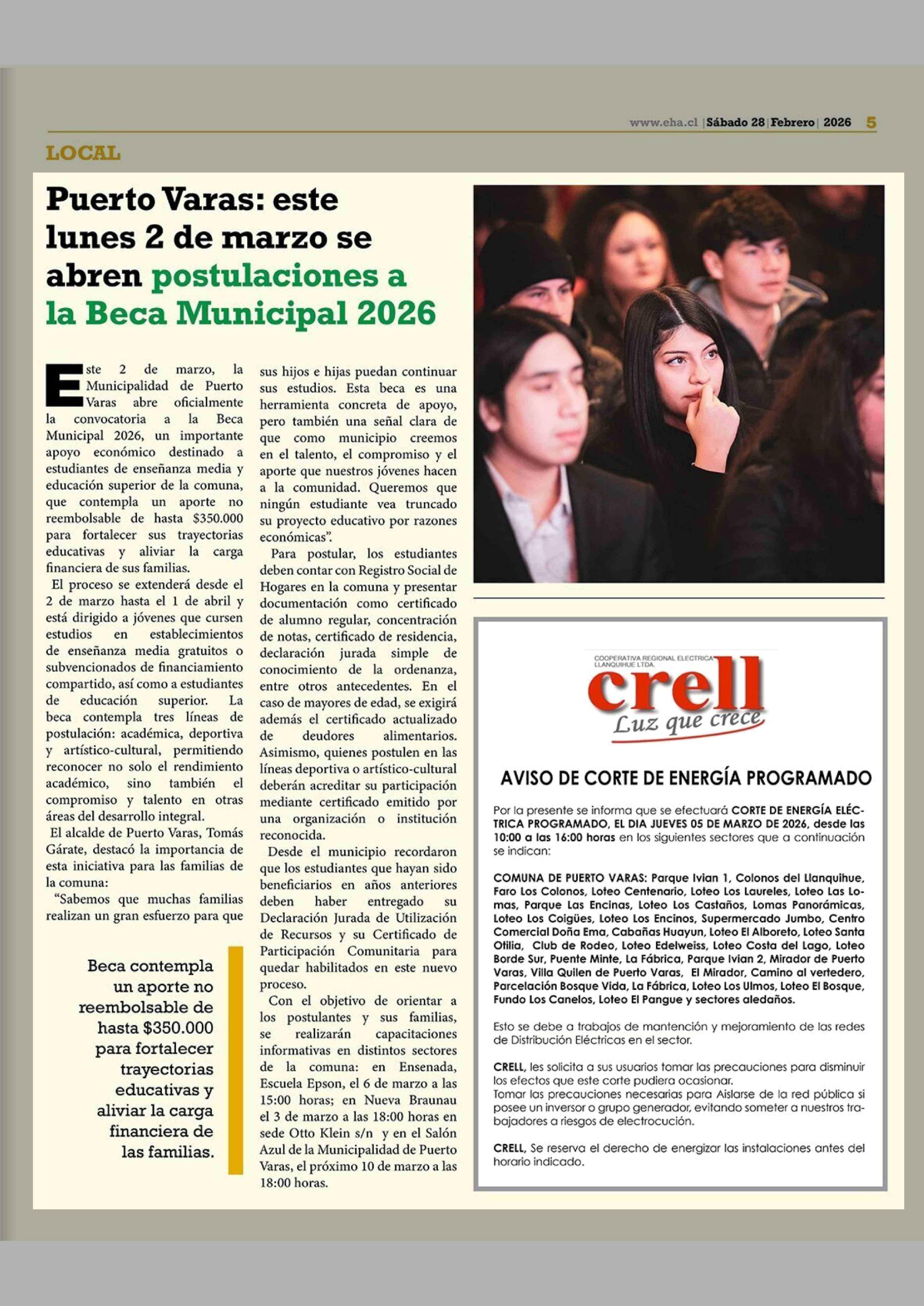 Puerto Varas: este lunes 2 de marzo se abren postulaciones a la Beca Municipal 2026 28-02-2026 El Heraldo Austral |