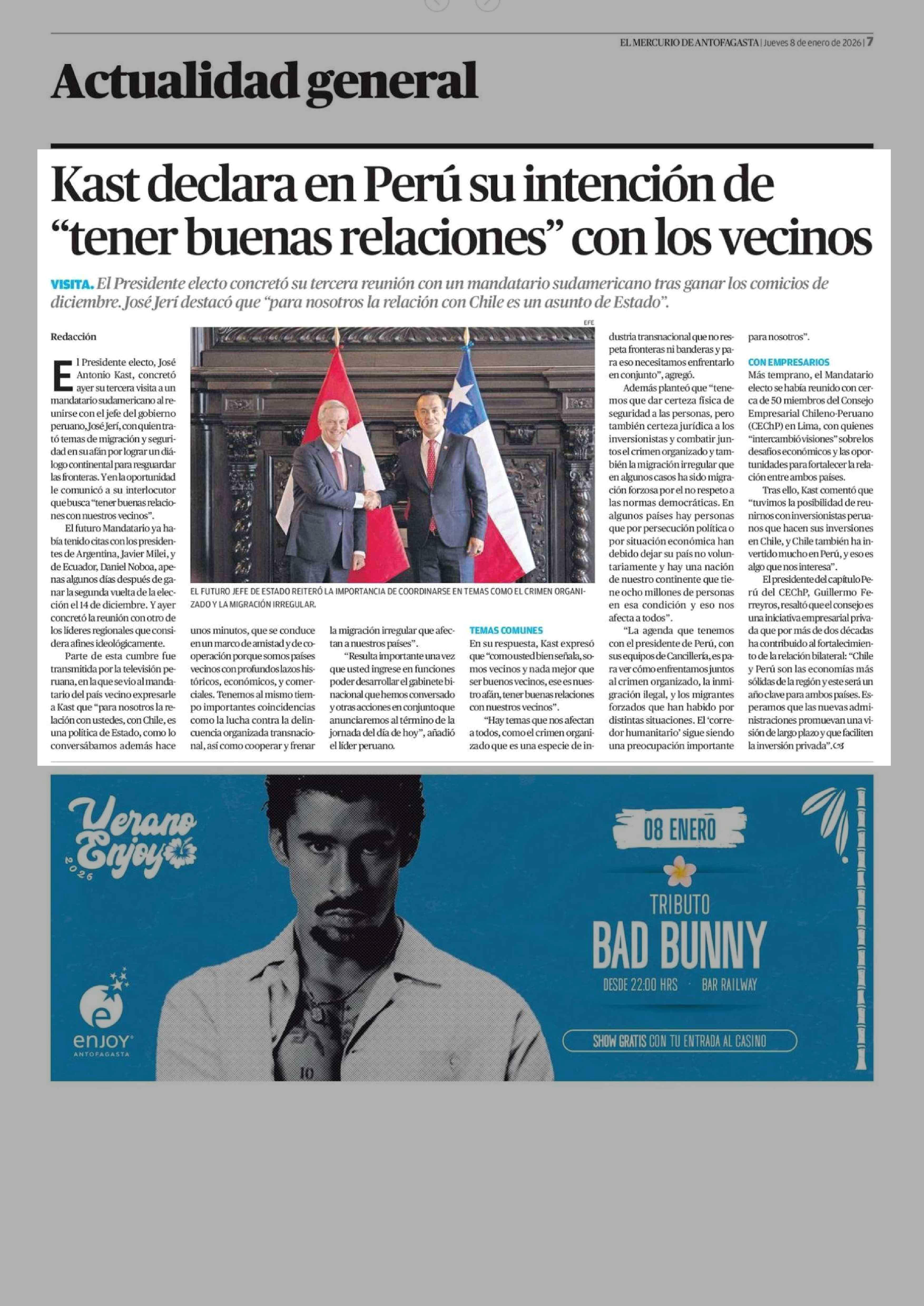 Kast declara en Perú su intención de "tener buenas relaciones" con los vecinos 08-01-2026 El Mercurio de Antofagasta |