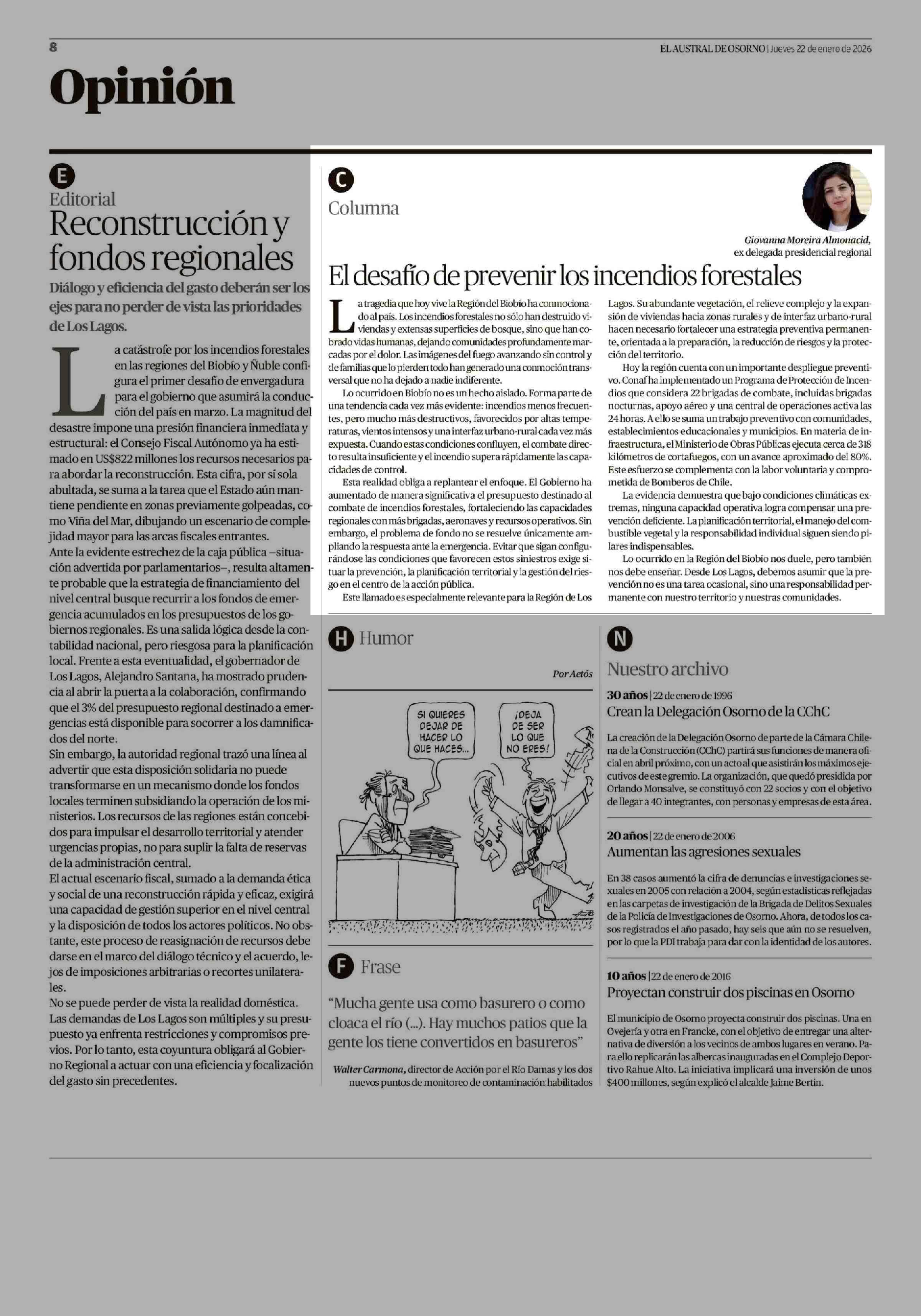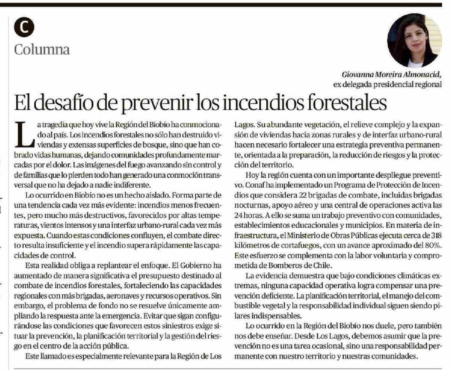 Columnas de Opinión: El desafío de prevenir los incendios forestales 22-01-2026 El Austral de Osorno |