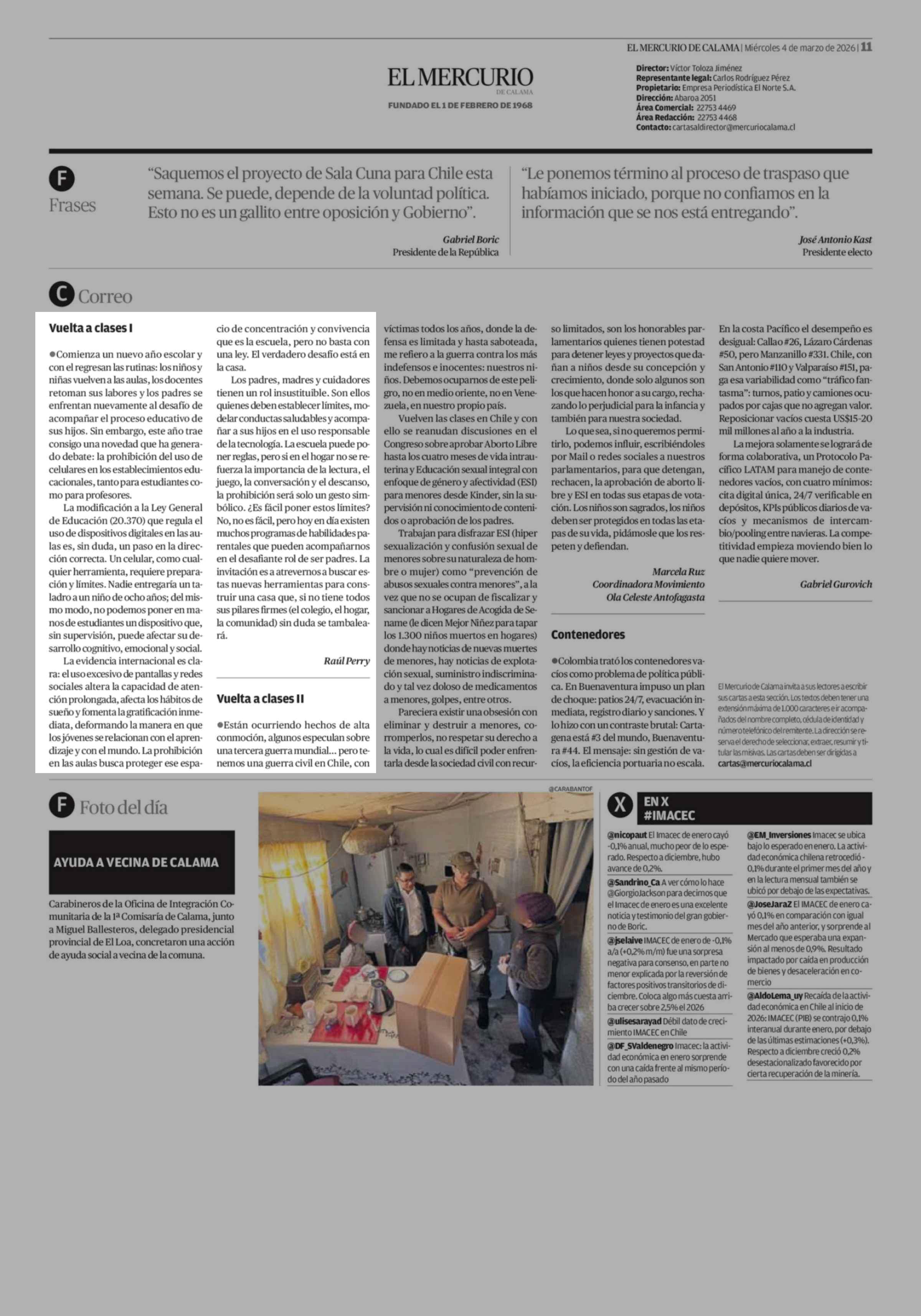 CARTAS: Vuelta a clases I 04-03-2026 El Mercurio de Calama |