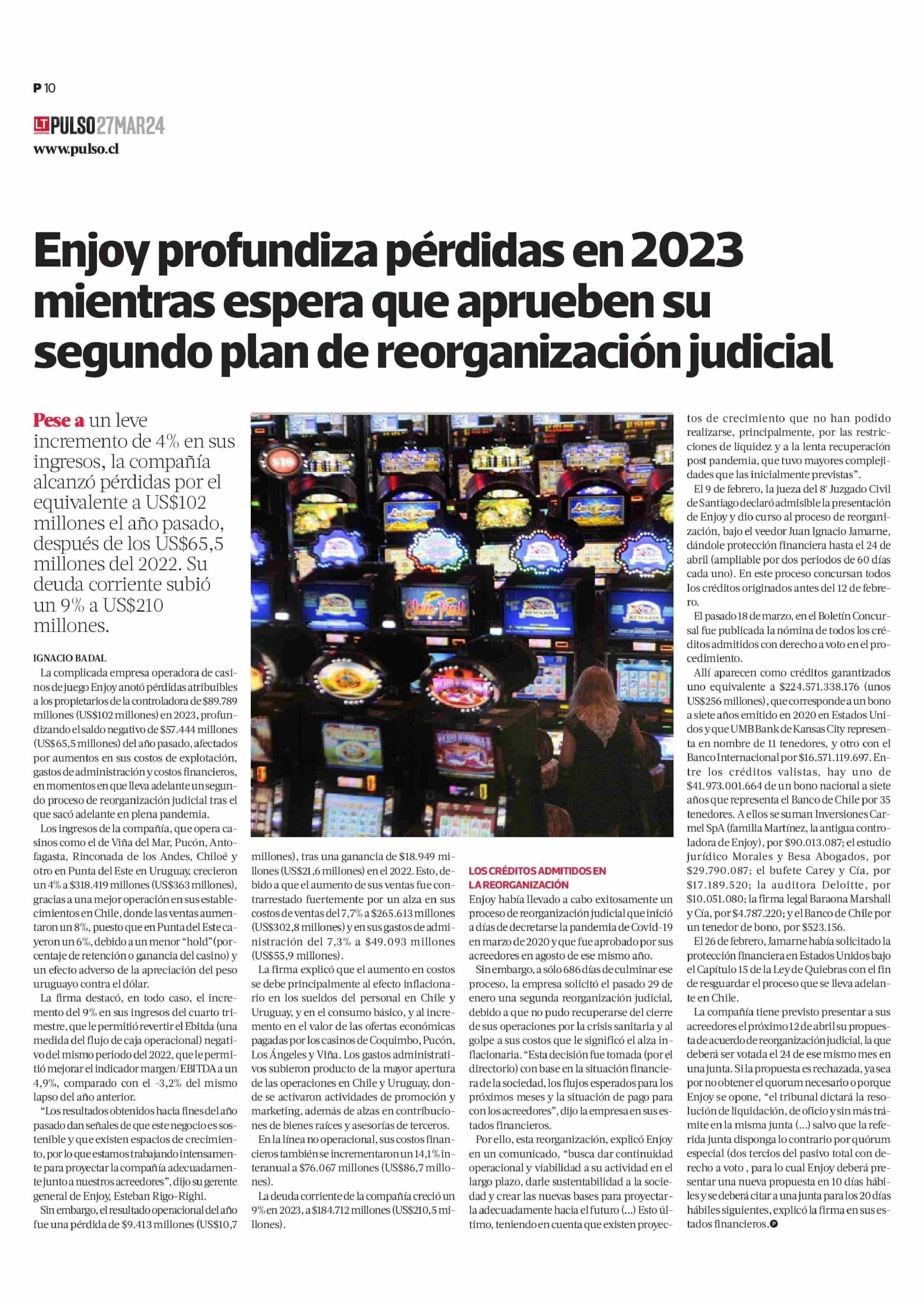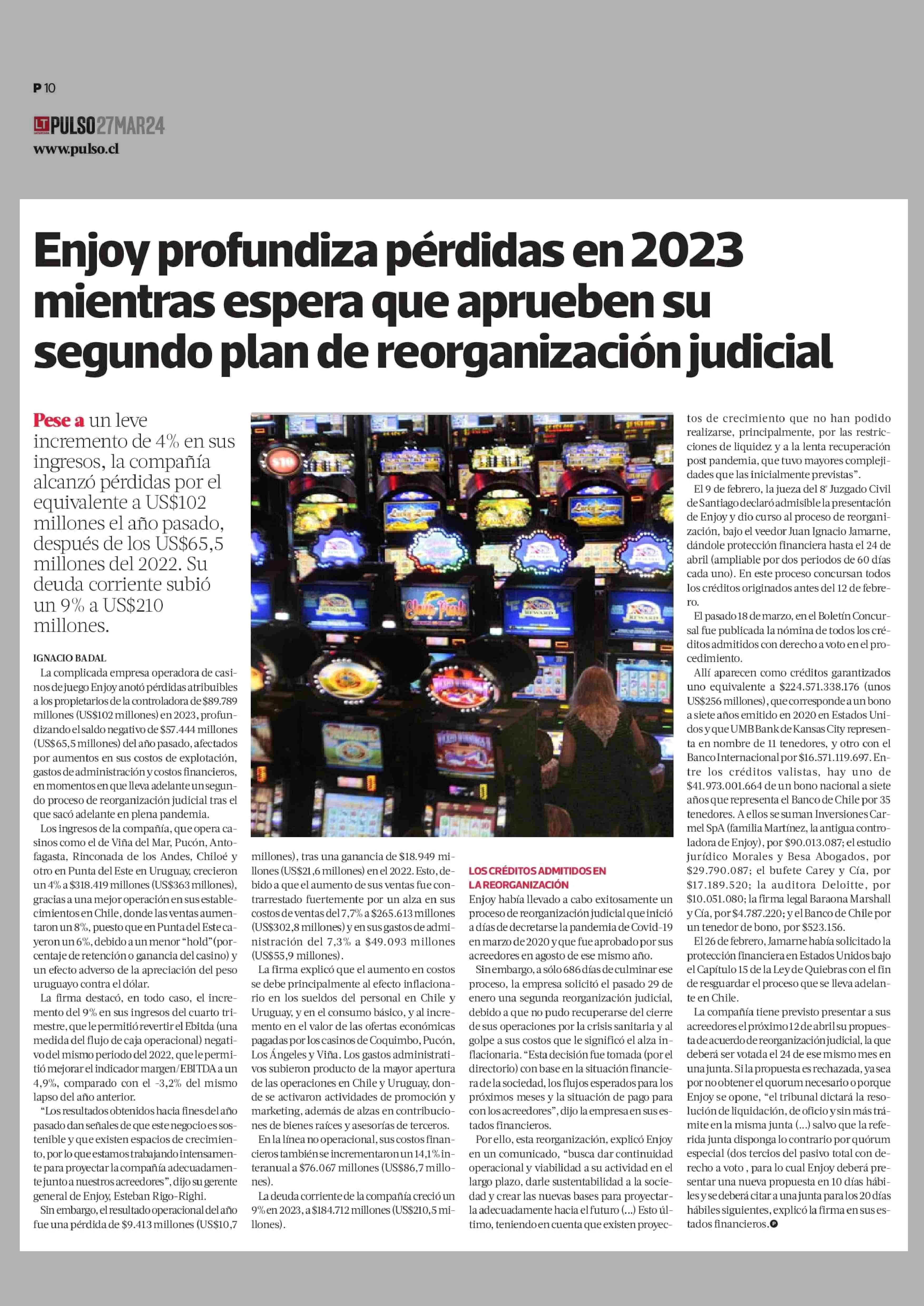Título: Enjoy profundiza pérdidas en 2023 mientras espera que aprueben su segundo plan de reorganización judicial