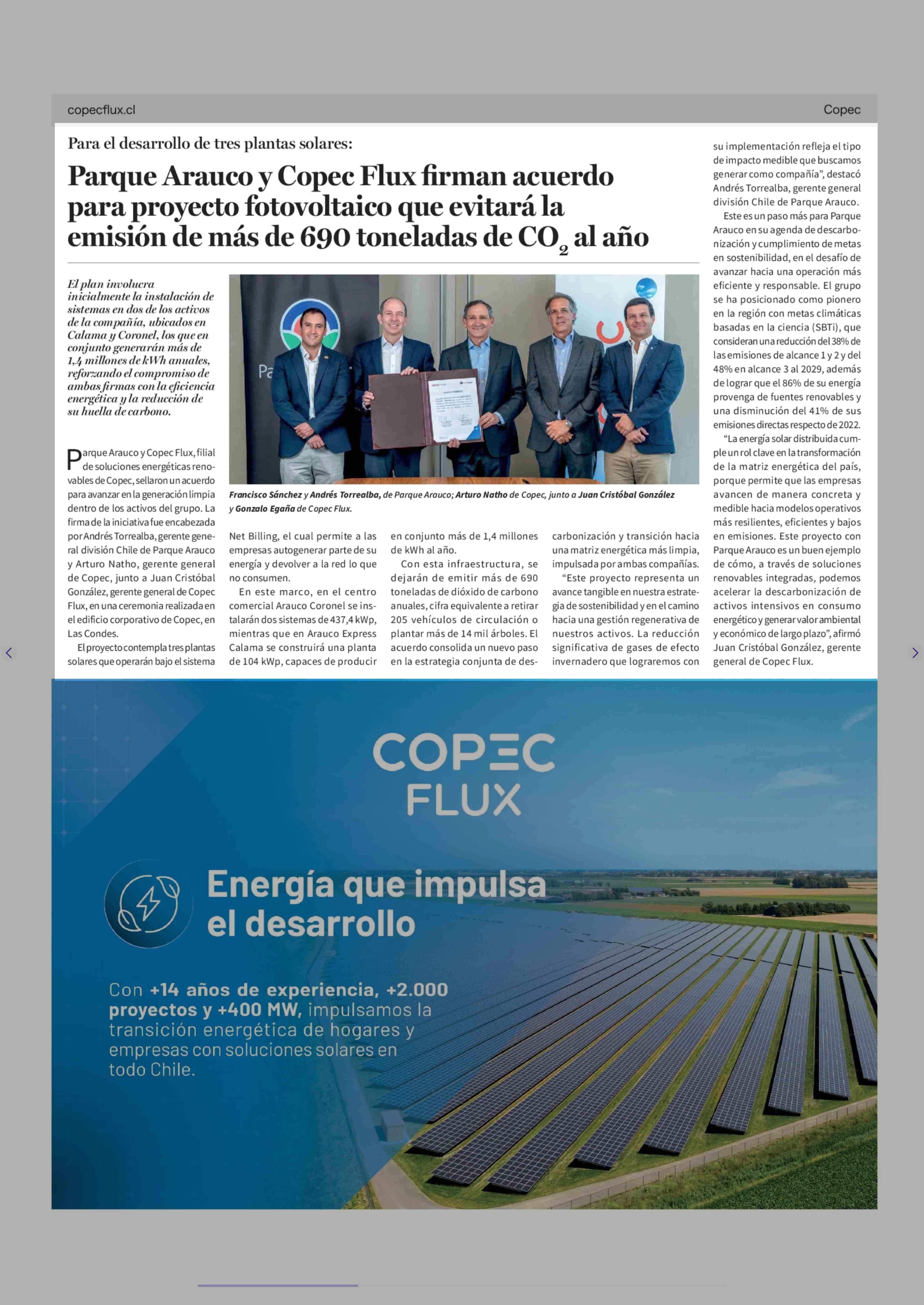 Parque Arauco y Copec Flux firman acuerdo para proyecto fotovoltaico que evitará la emisión de más de 690 toneladas de CO2 al año 18-01-2026 La Tercera |