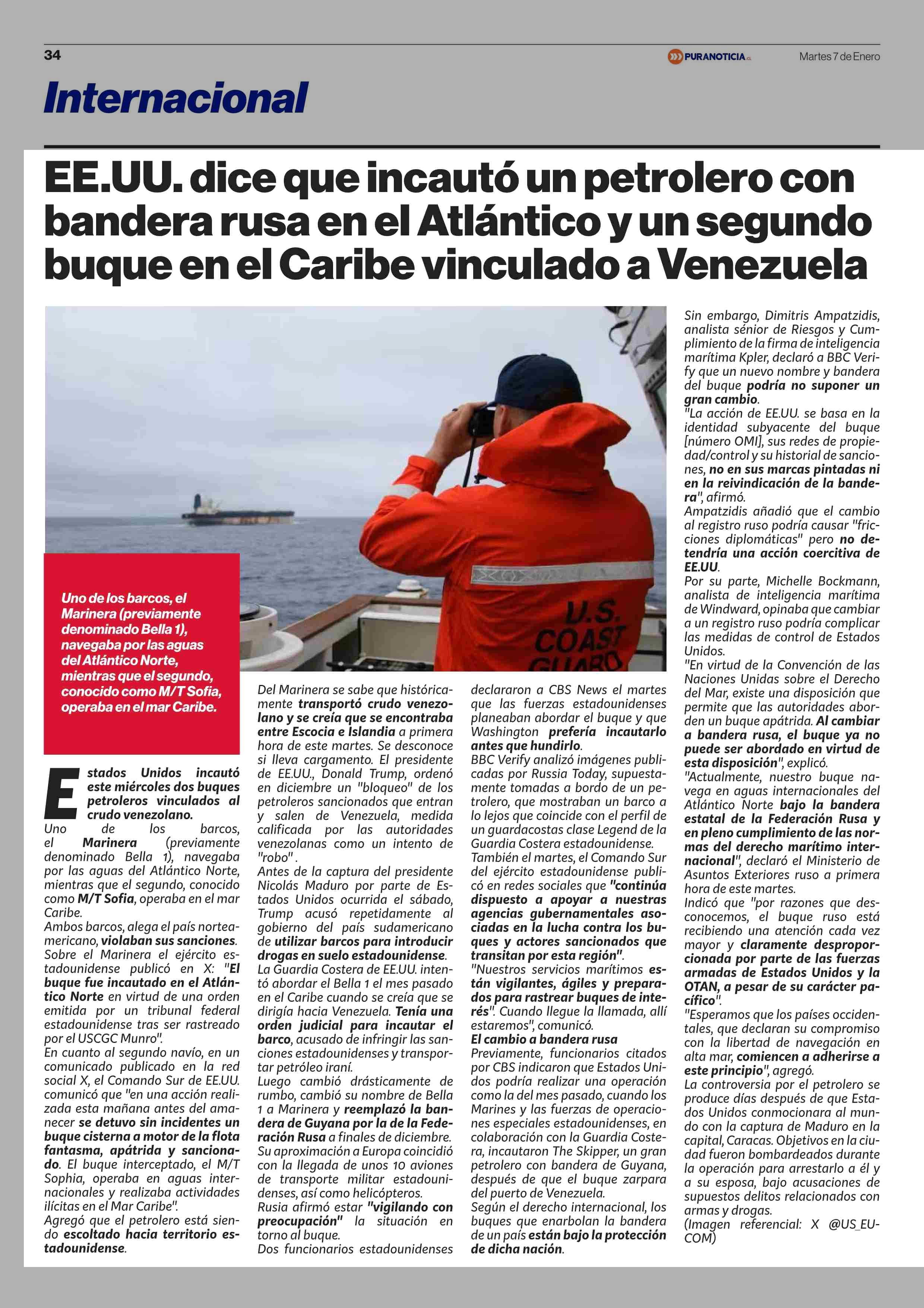 EE.UU. dice que incautó un petrolero con bandera rusa en el Atlántico y un segundo buque en el Caribe vinculado a Venezuela 07-01-2026 Puranoticia.cl |
