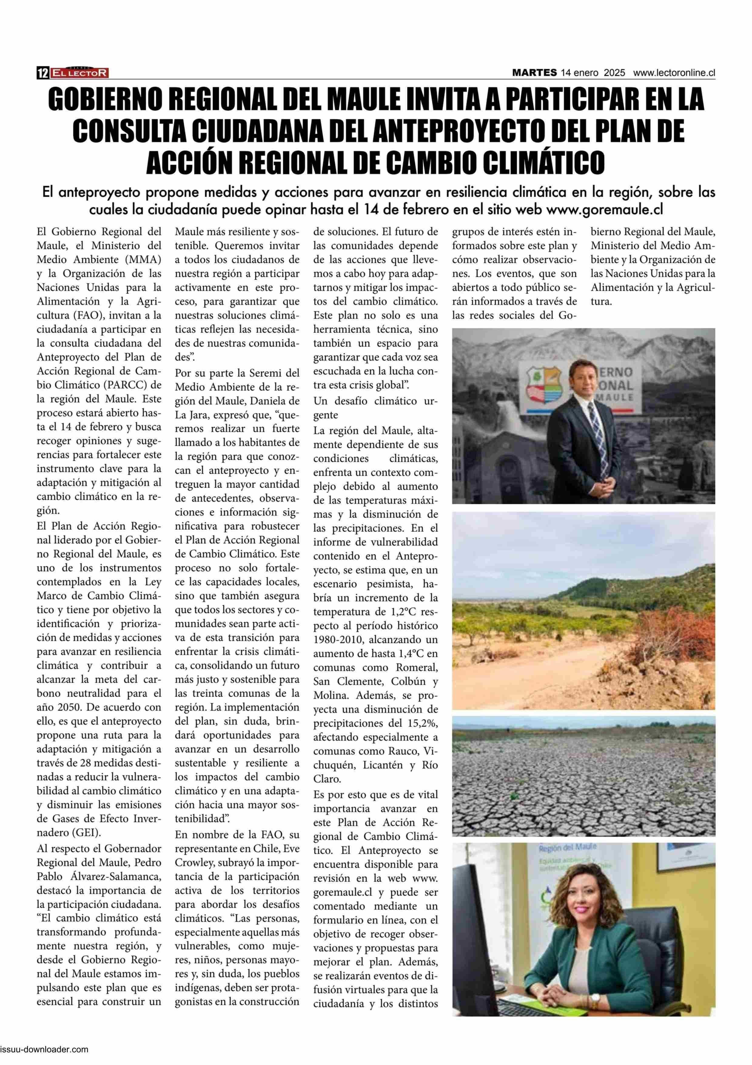 GOBIERNO REGIONAL DEL MAULE INVITA A PARTICIPAR EN LA CONSULTA CIUDADANA DEL ANTEPROYECTO DEL PLAN DE ACCIÓN REGIONAL DE CAMBIO CLIMÁTICO 14-01-2025 El Lector |