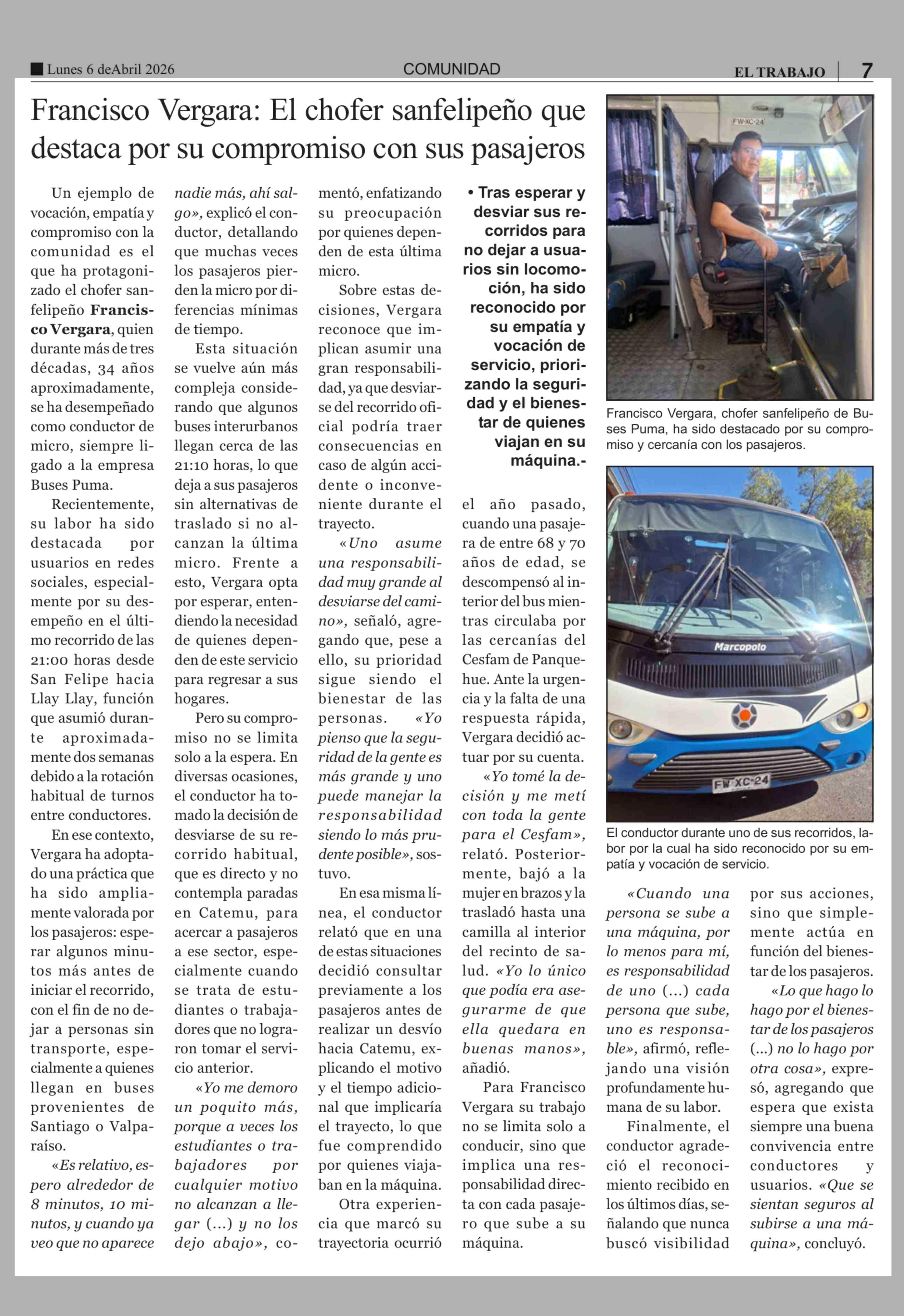 Francisco Vergara: El chofer sanfelipeño que destaca por su compromiso con sus pasajeros 06-04-2026 El Trabajo |