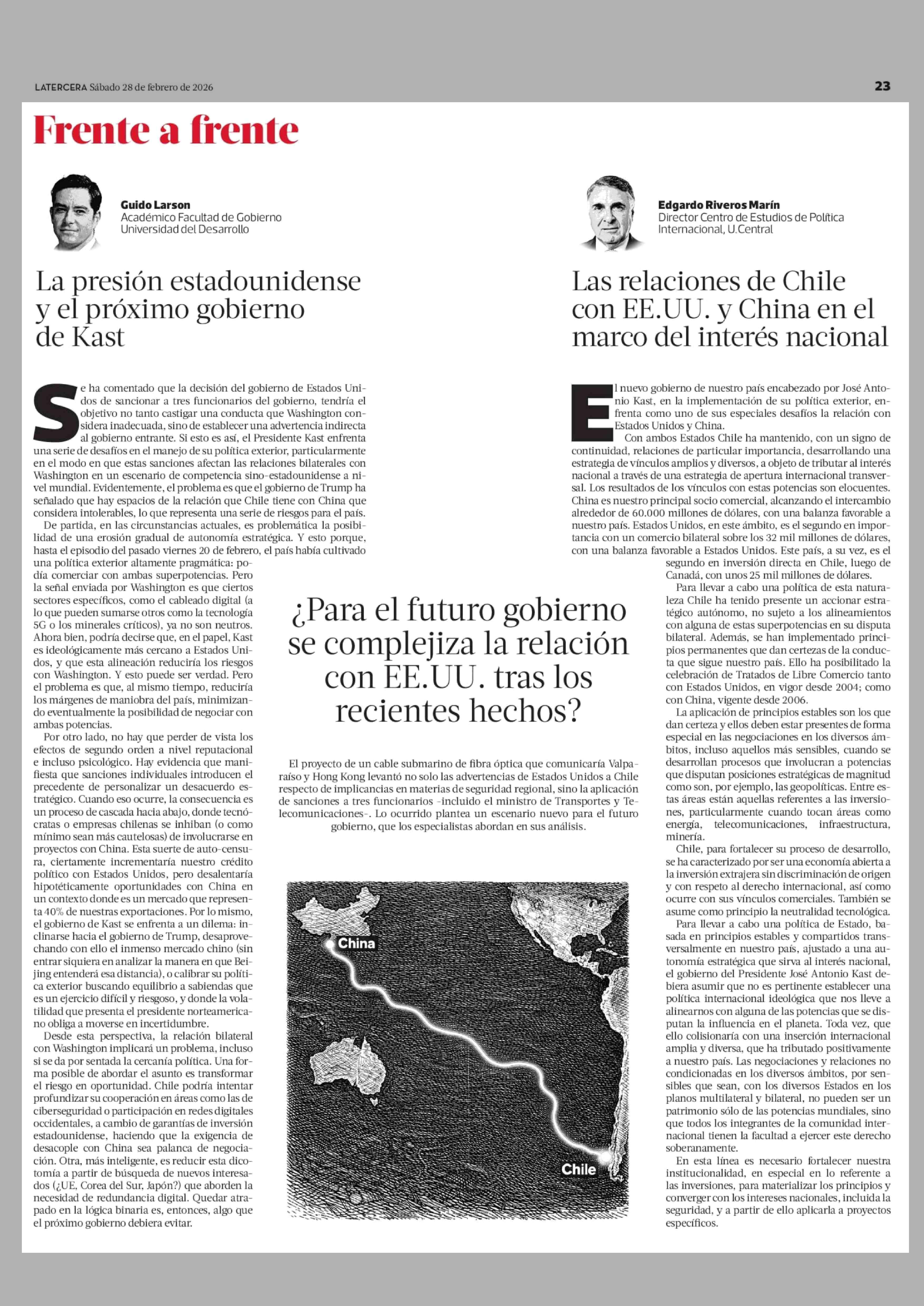 Para el futuro gobierno se complejiza la relación con EE.UU. tras los recientes hechos? 28-02-2026 La Tercera |