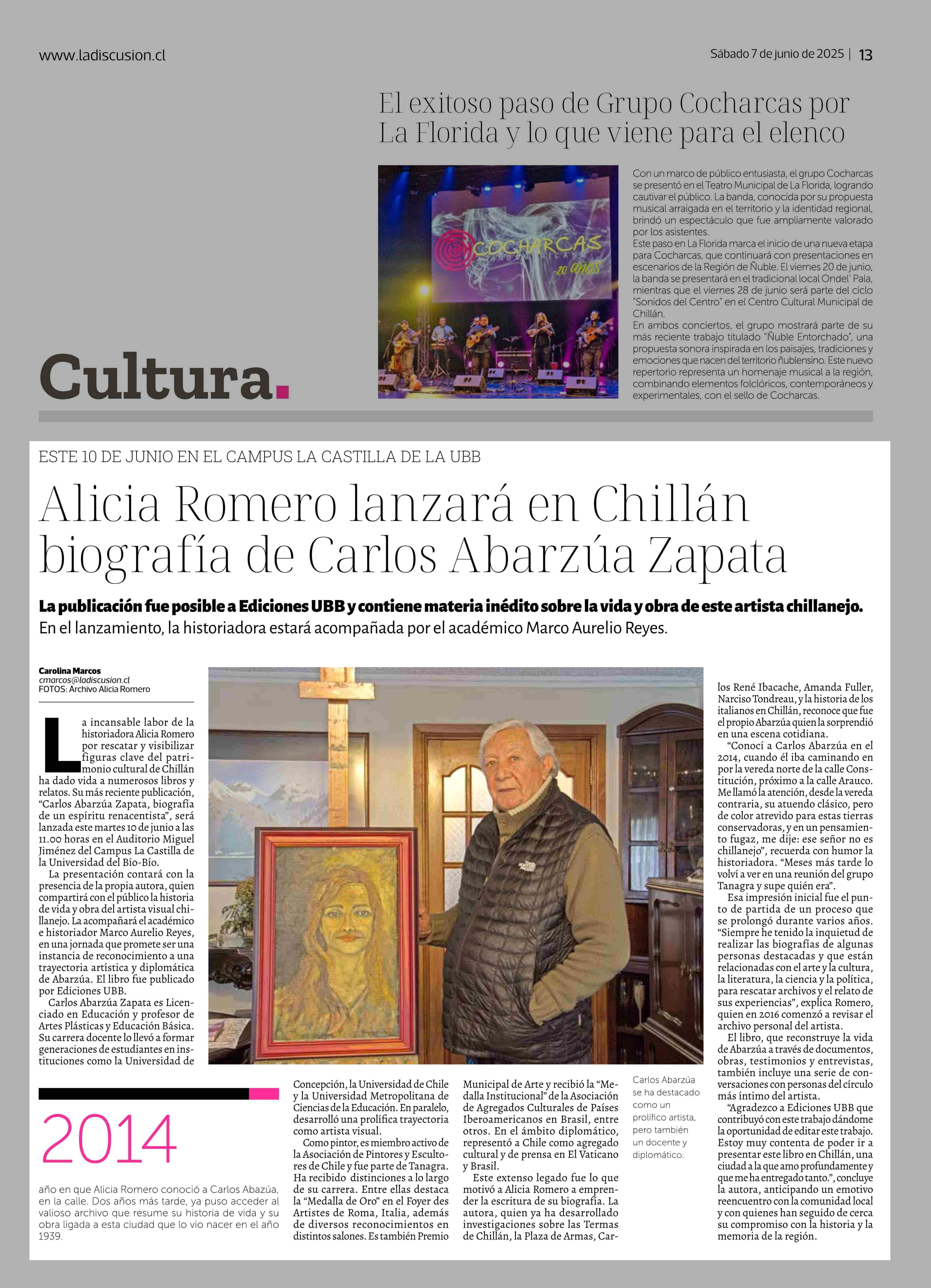 | Título: | Alicia Romero lanzará en Chillán biografía de Carlos Abarzúa Zapata |