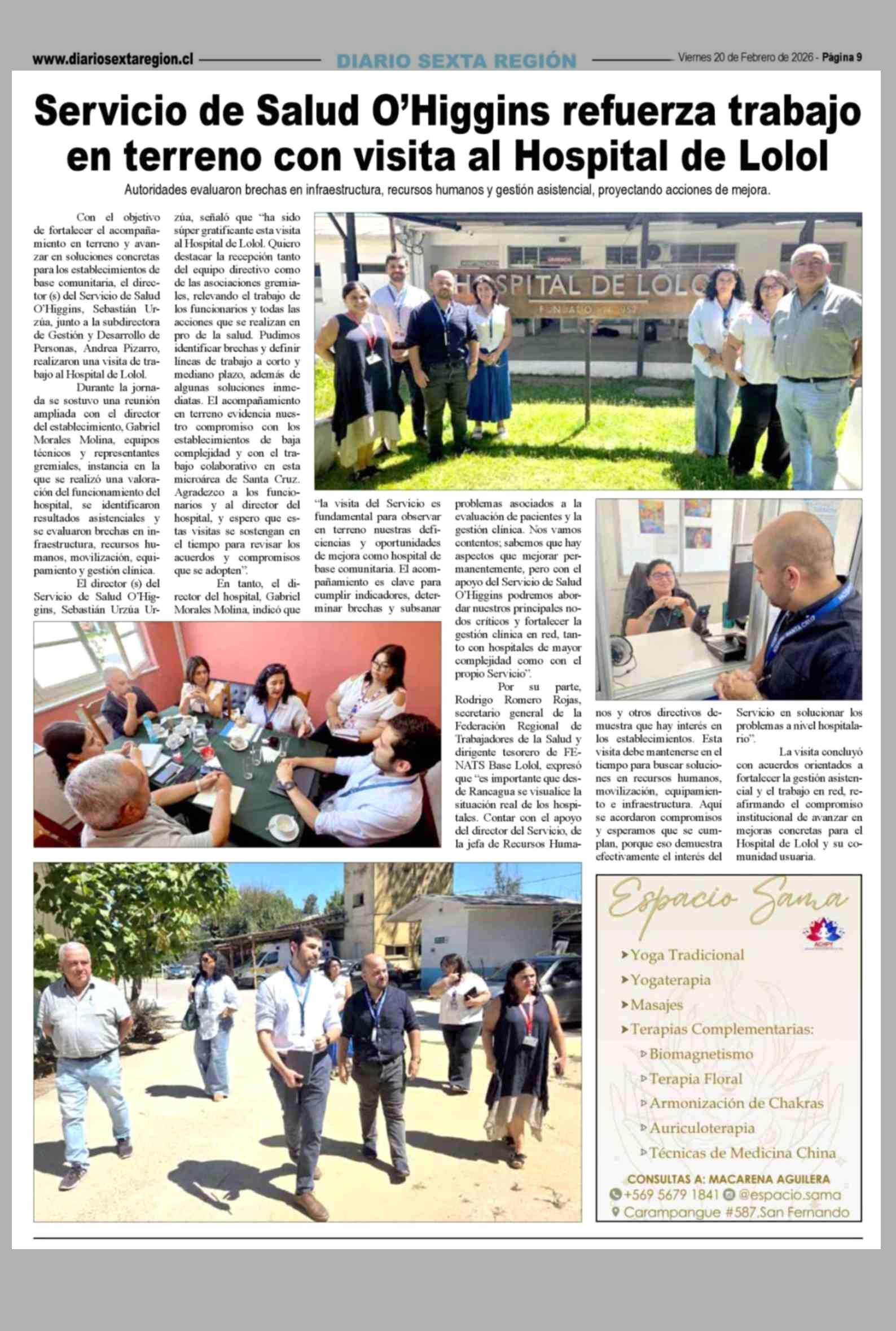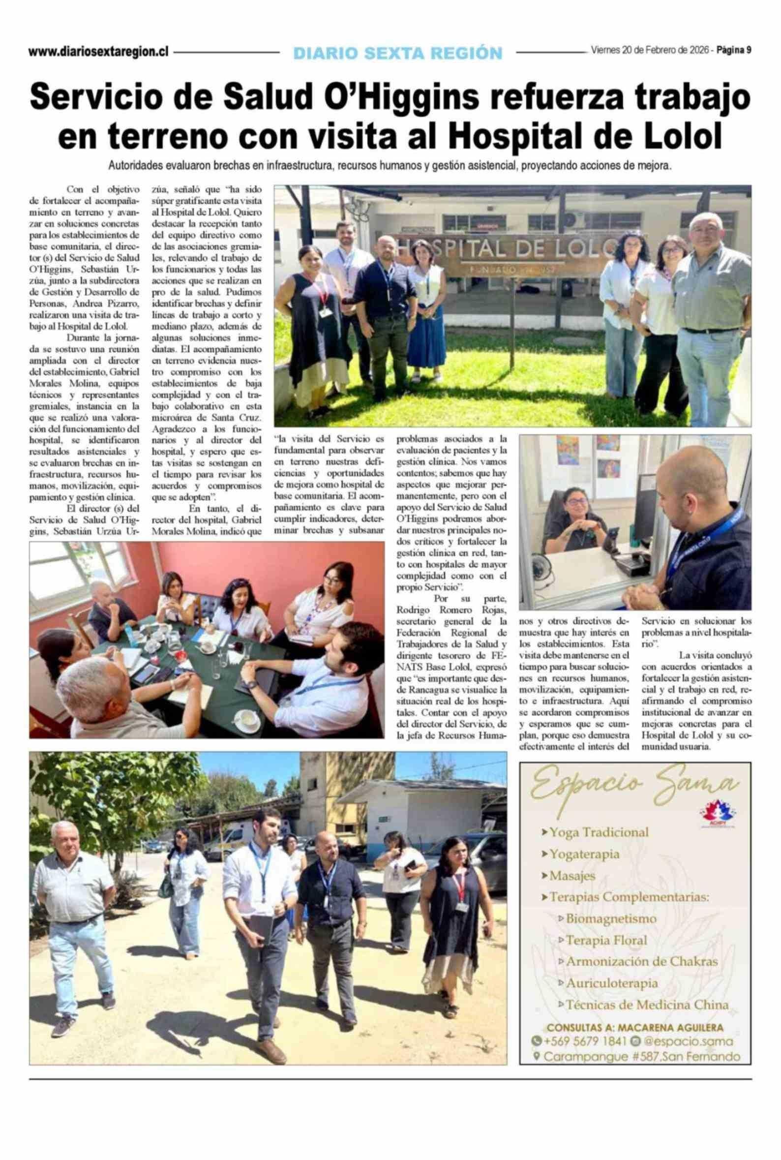 Servicio de Salud O'Higgins refuerza trabajo en terreno con visita al Hospital de Lolol 20-02-2026 Diario VI Región |