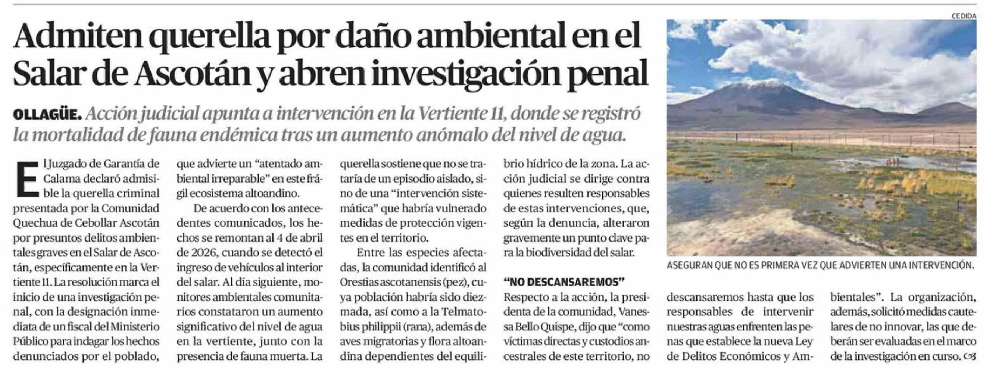 Admiten querella por daño ambiental en el Salar de Ascotán y abren investigación penal 24-04-2026 El Mercurio de Calama |