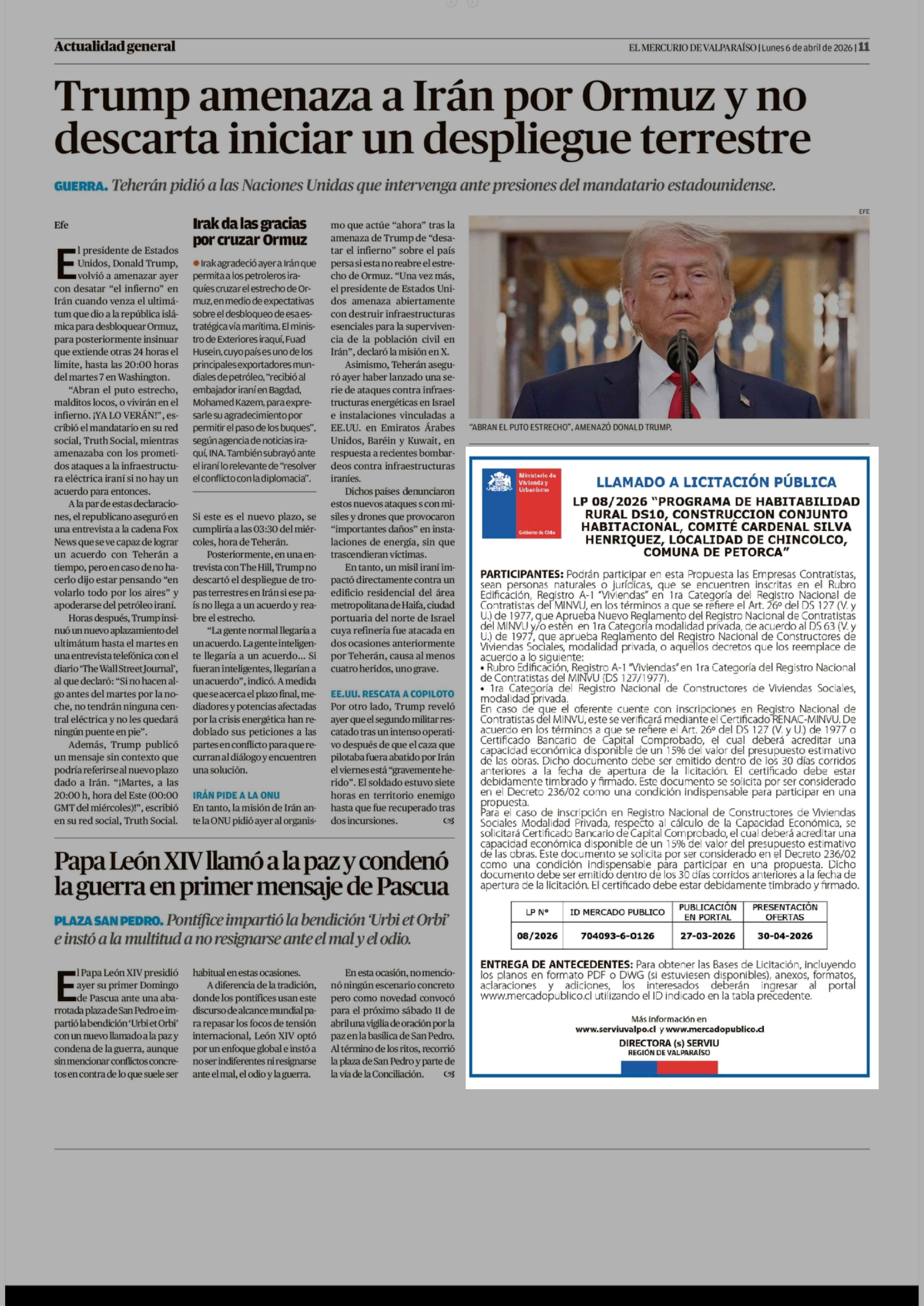 AVISO LICITACIONES: LLAMADO A LICITACIÓN PÚBLICA 06-04-2026 El Mercurio de Valparaíso |