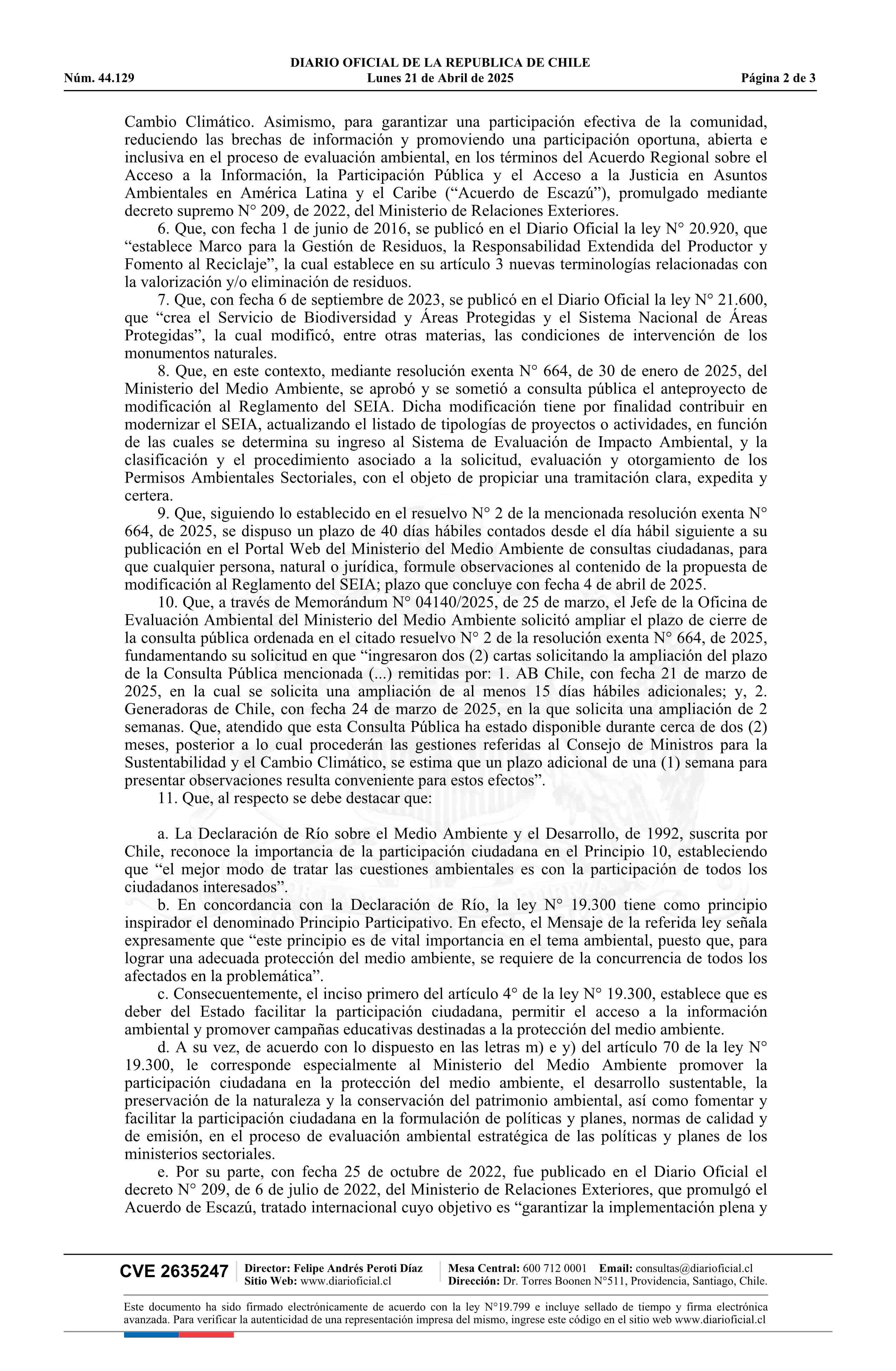 Resolución exenta número 1.716, de 2025.- Amplía plazo de consulta pública de anteproyecto de modificación al decreto N° 40, de 2012, que establece el Reglamento del Sistema de Evaluación de Impacto Ambiental