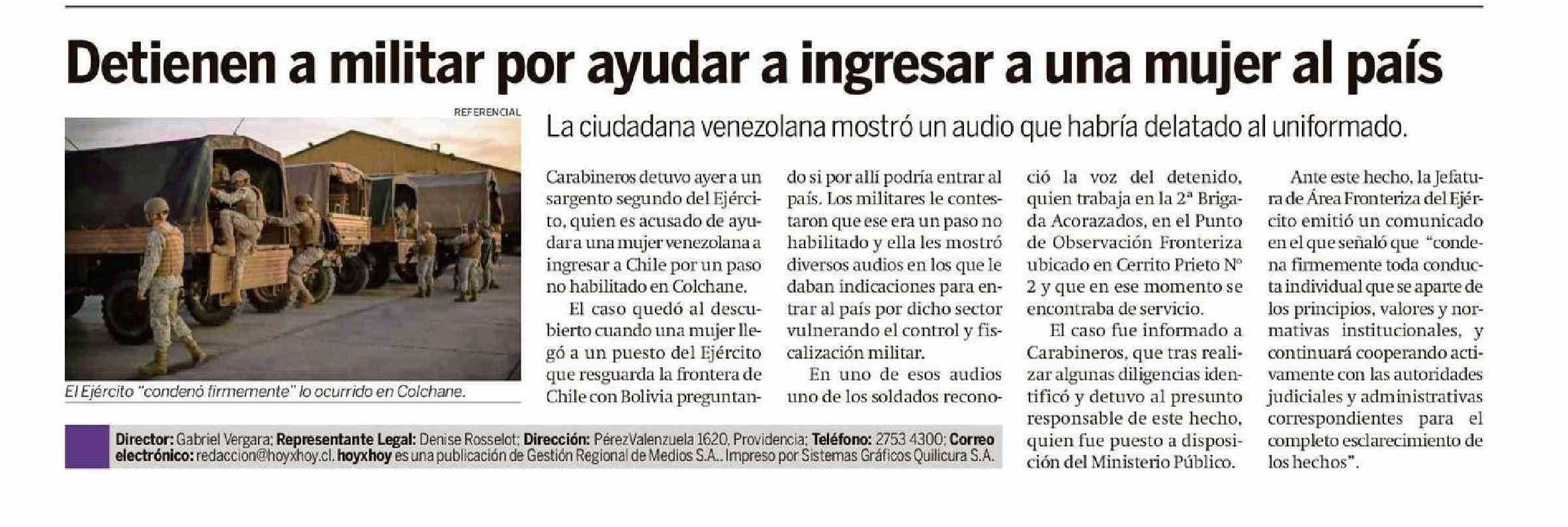 | Título: | Detienen a militar por ayudar a ingresar a una mujer al país |
