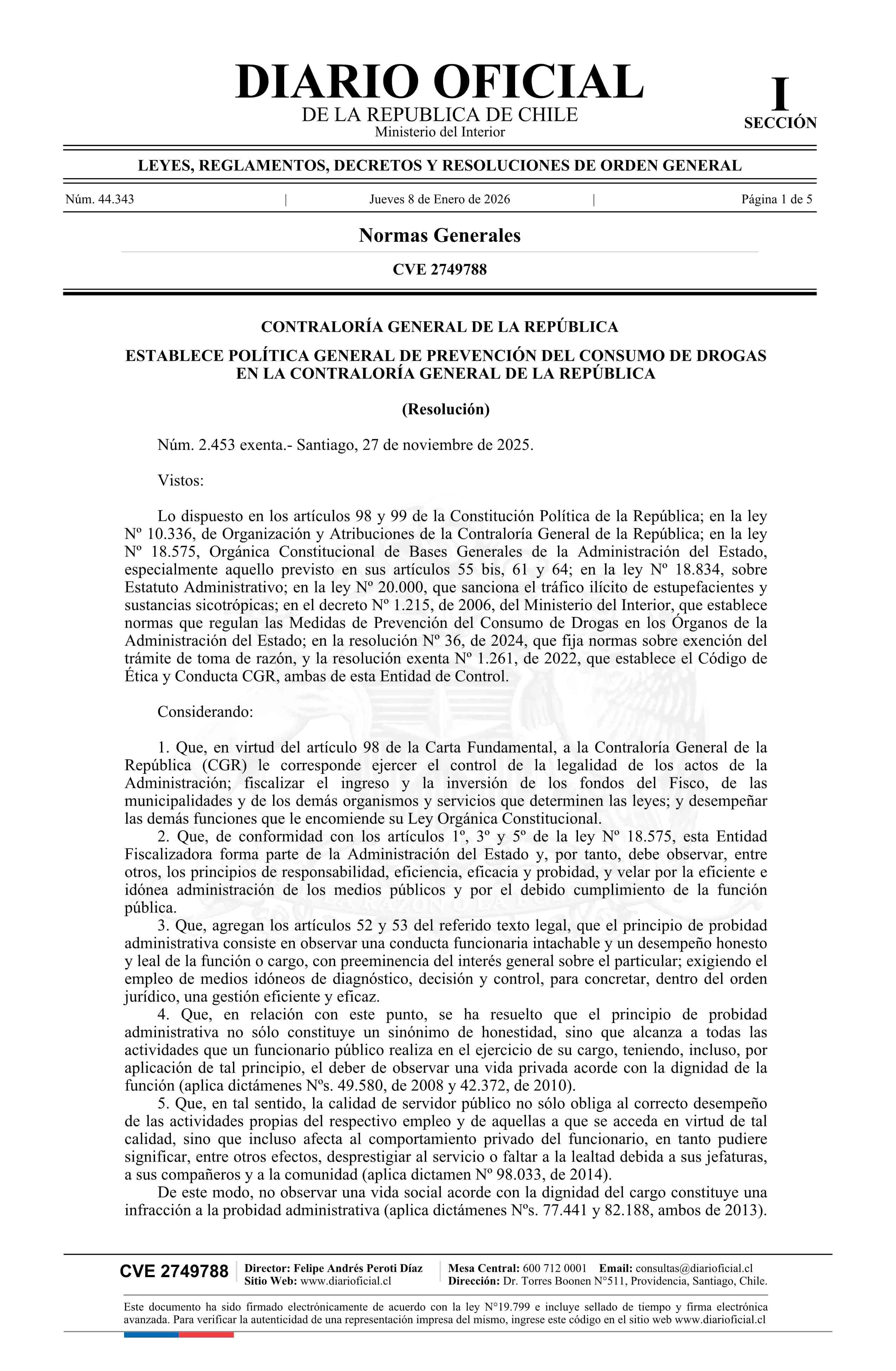 Resolución exenta número 2.453, de 2025.- Establece política general de prevención del consumo de drogas en la Contraloría General de la República 08-01-2026 DIARIO OFICIAL CHILE - BOLETÍN OFICIAL DE MINERÍA |