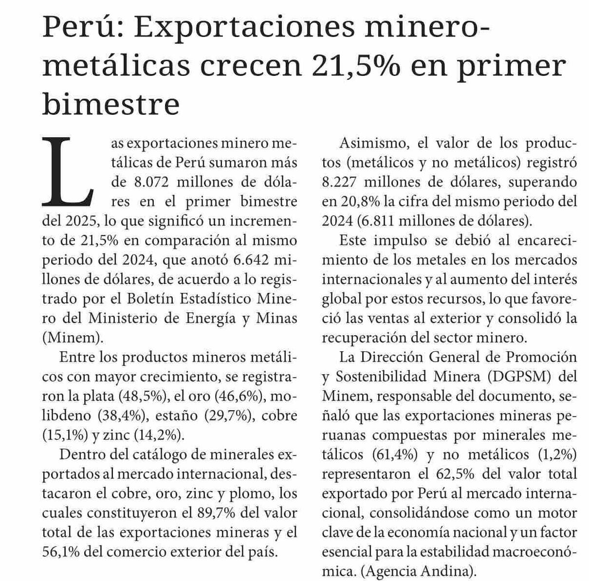 Perú: Exportaciones minero- metálicas crecen 21,5% en primer bimestre 26-05-2025 Diario Chañarcillo |
