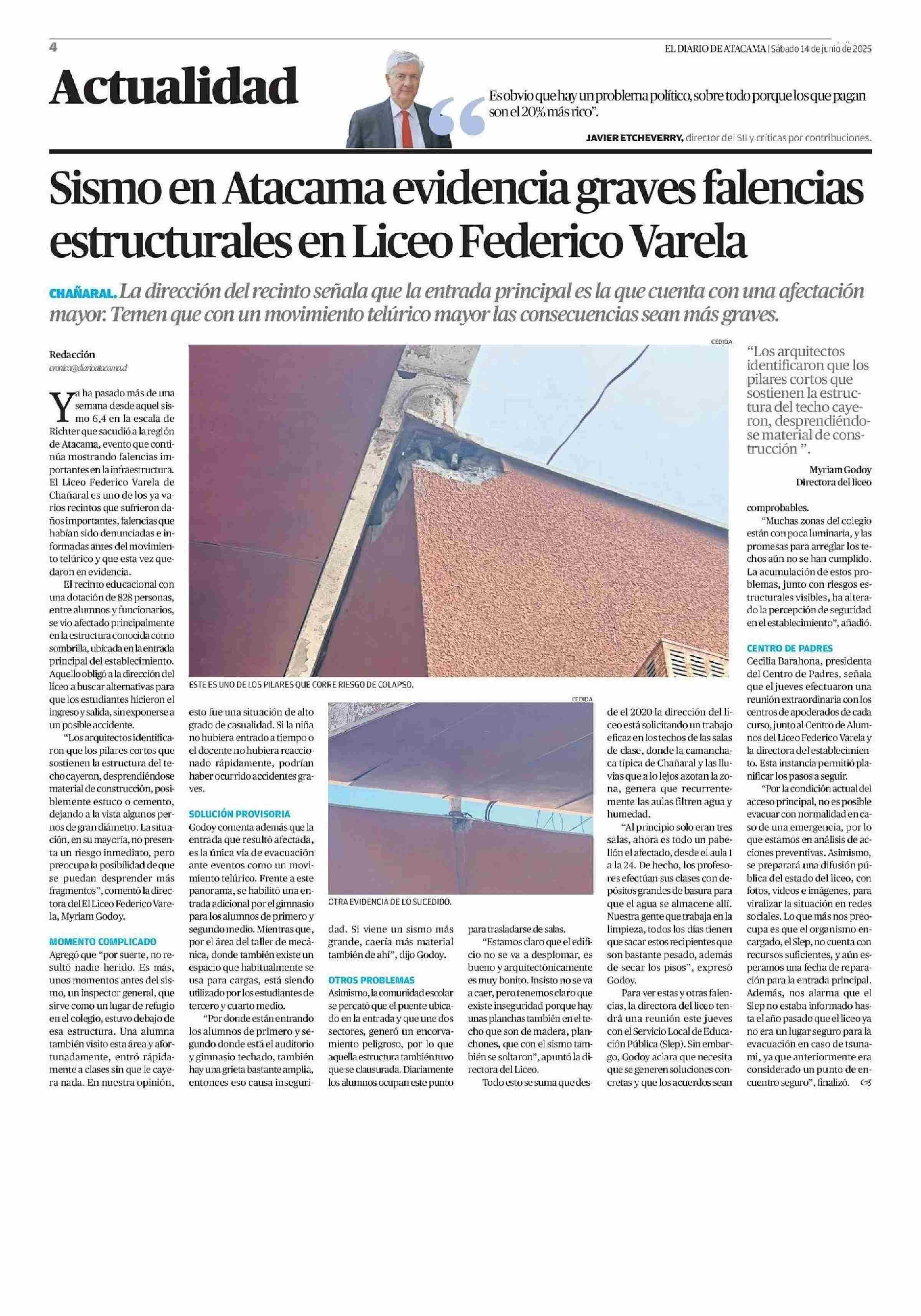 Sismo en Atacama evidencia graves falencias estructurales en Liceo Federico Varela 14-06-2025 El Diario de Atacama |