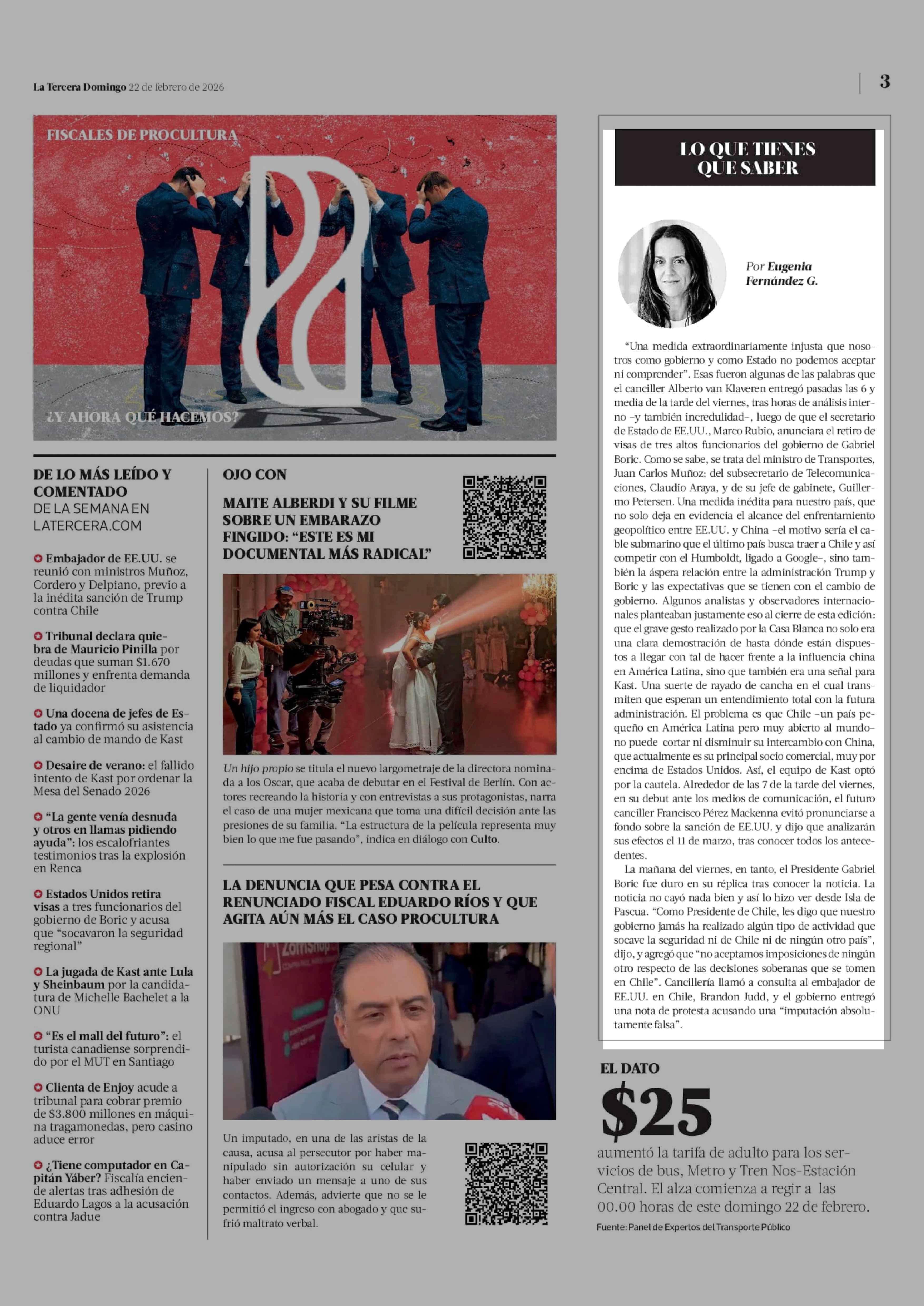 Columnas de Opinión: LO QUE TIENES QUE SABER 22-02-2026 La Tercera |
